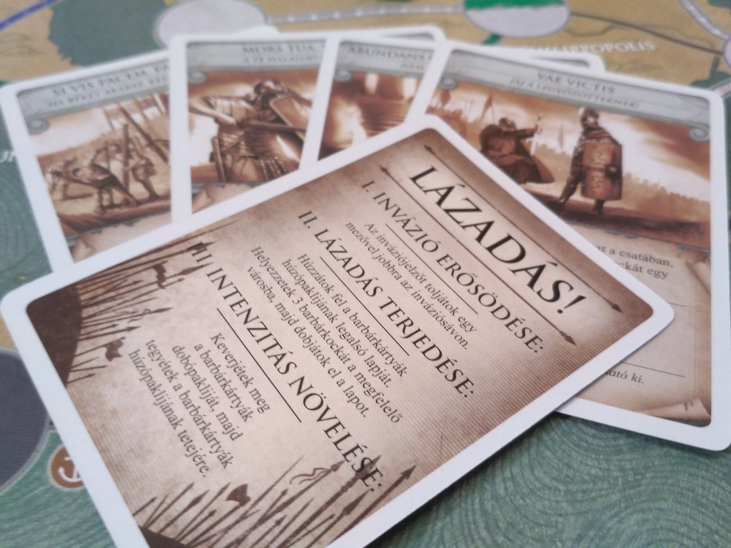 A karakterek képességei és az új eseménykártyák valamennyire kompenzálnak a rossz gurításokért, de ettől még természetesen pont akkor fogunk a legszerencsétlenebbül dobni, amikor a legkevésbé hináyzik. Ezért ez a fajta Pandemic másféle stratégiát kíván, mint az eddig megszokott. A barbárok öt irányból támadnak és pillanatok alatt elszaporodnak a városokban. A katonáink pedig olyan dilettánsak, hogy ha nincs velük egy vezér vagy egy erőd, akkor egyetlen kósza megszálló képes egymaga bedarálni az egész seregünket. Figyelnünk kell tehát arra, hogy megfelelő védelmet hagyjunk magunk mögött.