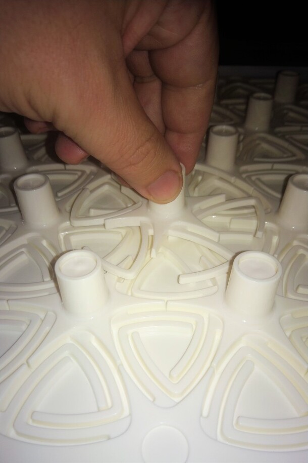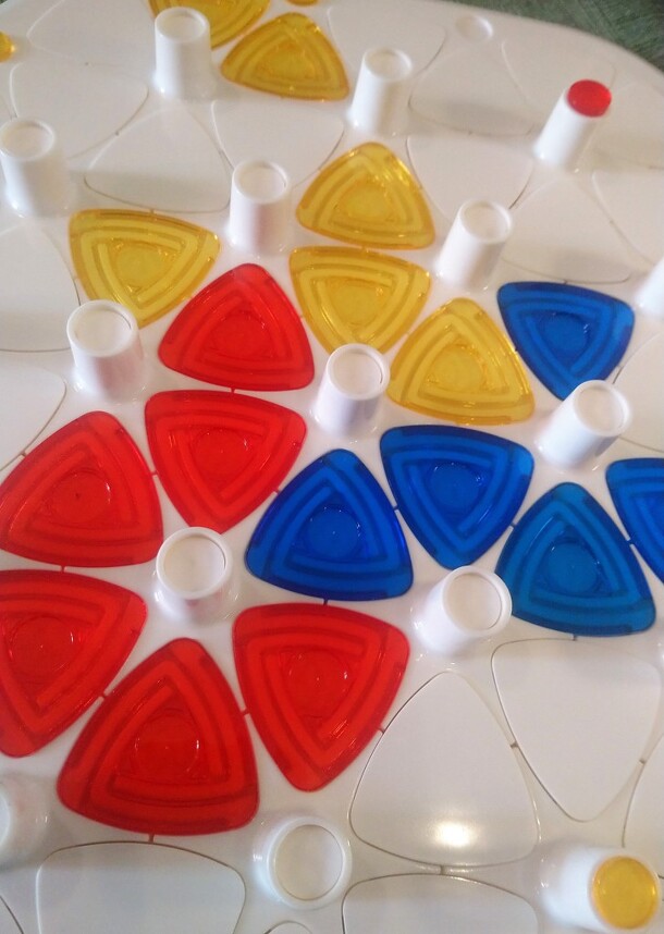 A táblán 19 torony helyezkedik el, körülöttük hat-hat háromszög formájú mélyedés. Az elrendezésből fakadóan egyes mélyedések kettő vagy akár három toronyhoz is tartozhatnak. Az előkészületek során ezekbe a mélyedésekbe kell belerakni a semleges és színes (játékosokhoz tartozó) lapkákat. A színes lapkák elrendezését mindig a játékmód (ezekből a szabályfüzetekben négy van), illetve a játékosok száma határozza meg. A fehér lapkákkal kell feltölteni a megmaradt mélyedéseket, ezzel elfedve a forgató mechanikát. Ezek célja tehát esztétikai. A tornyok tetején, a színes lapkákon illetve a tábla szélén is kerek mélyedések találhatóak, ezekbe passzolnak a kis színes korongok. Az ilyen helyekre tett korongoknak, játékváltozatól függően, jelölő vagy erőforrás funkciója is lehet. Itt-ott éreztem kis méretbeli problémát, a korongok néha nehezen illeszkednek a mélyedésekbe. A szürke és fekete színű játékoselemek gyenge fényben könnyen összetéveszthetőek, igaz, ezekre a legtöbb játékmódban és játéksoszámnál, nincs szükség. Ezt leszámítva minden rendesen passzol, forog ahogy kell. Kivitelezésre nem lehet panasz, a játékelemek egységes vizuális hatást nyújtanak.