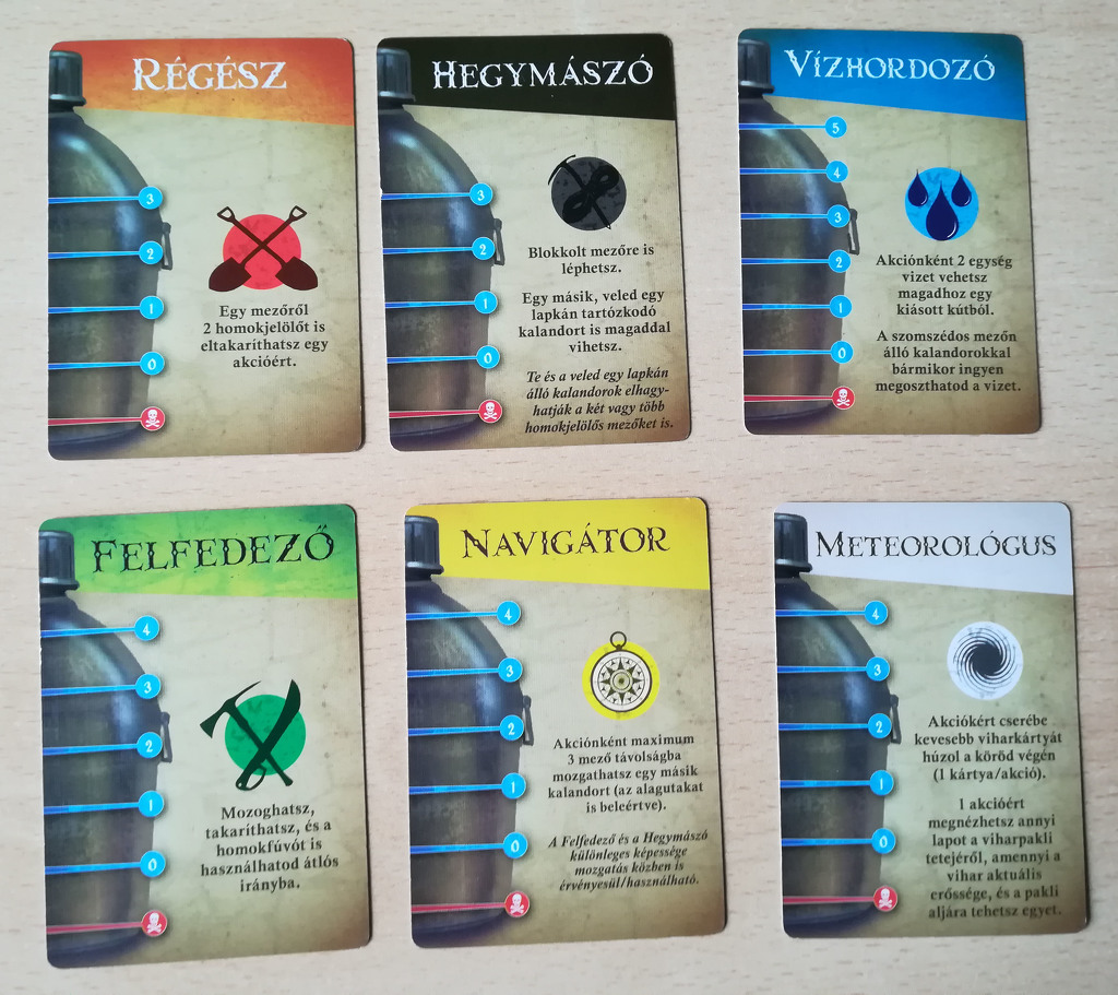 - Vízhordó: a szomszédos mezőn található játékosokkal is ingyen megoszthatja a vízkészletét. Ha egy kiásott kútnál tartózkodik, egy akciópontért cserébe két egység vizet vételezhet.