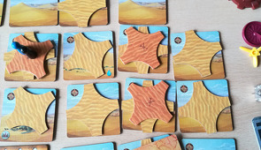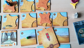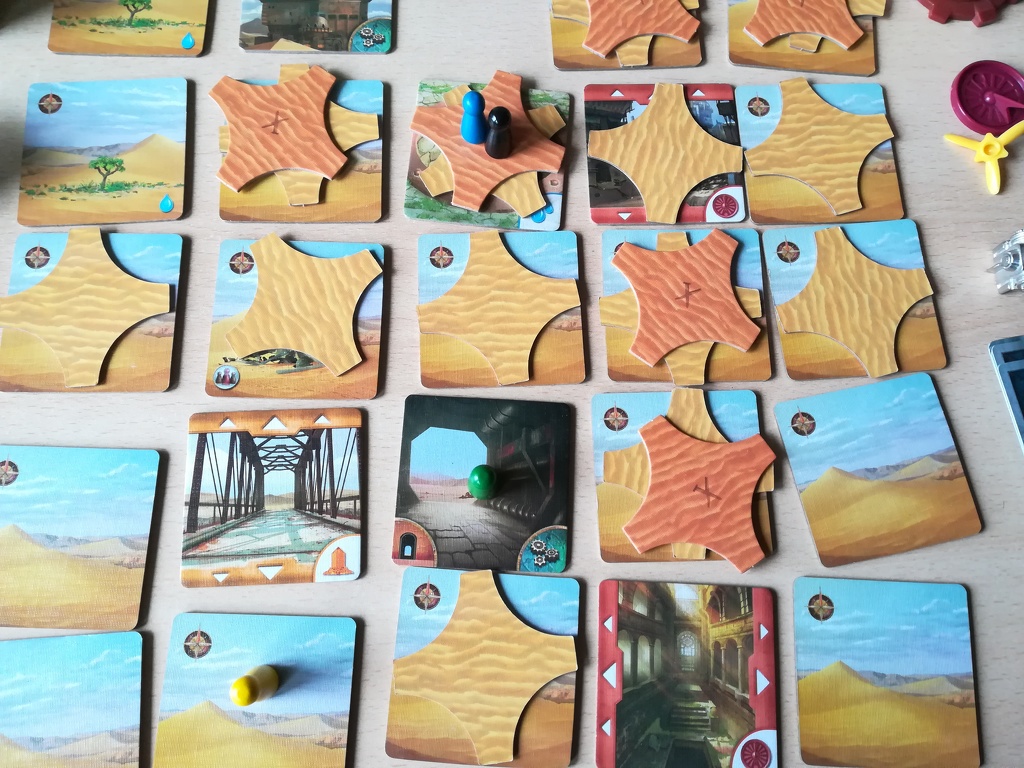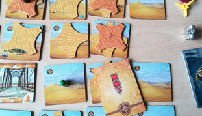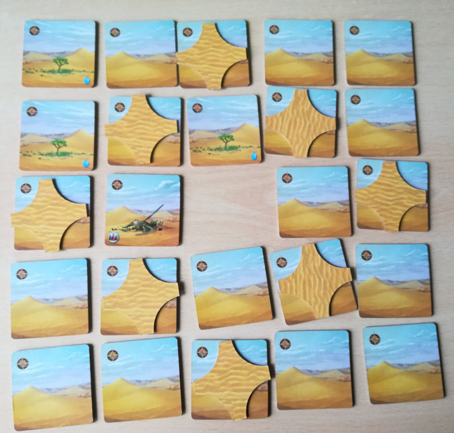 Ahogy a Tiltott szigetnél, itt is minden lapka két oldallal rendelkezik. Az egyik oldal a sivatag, míg a másik egy elfeledett város romjait takarja. Ha sikerül kiásnunk az adott területet megtudhatjuk, hogy mit rejt a sivatag. A lapkákon több információ is található, attól függően, hogy melyik oldalát látjuk. A sivatagos oldalon az egyik lapka a helikopterünk roncsait mutatja, minden karakter innen kezdi a kalandot. Szintén itt találjuk a három oázist jelző lapot, azonban tartsuk észben,hogy ezek közül az egyik délibábot rejt, így nem mindegyik juttathat vízhez minket. A város oldalon három különlegesebb lapot figyelhetünk meg: