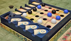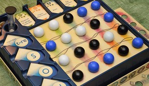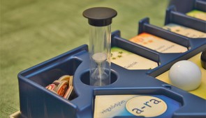 Tehát a játék egy szteroidozott Ország, város… Ha nagyon szigorú lennék, azt mondanám hogy a fenti idézet megfelel játékismertetőnek. De azért ilyen könnyen nem lenne illendő megúsznom a cikkírást. Lássuk az előkészületeket! Az ABC hátoldalú címkéket keverjük meg, osszuk négy egyenlő részre, és minden sor elé tegyünk egy-egy lefordított kupacot. A dobozbelsőben egyértelmű, hogy minek hol van a helye. A többi címkéből eldönthetjük hogy mely témacsoportokkal szeretnénk játszani (lehet akár az összessel is). Ezeket is keverjük meg, osszuk öt egyenlő részrei a paklit és minden oszlop tetejére tegyünk egyet, szintén képpel lefelé. A lyukas kartonlapot tegyük a címkék által közrefogott területre és véletlenszerűen tegyünk minden mélyedésbe egy golyót. A homokórát is a megfelelő mélyedésbe kell állítani. Mindenki tegye a figuráját a pontozósáv kezdőmezejére és vegyen maga elé egy tálkát. A 25 pontos jelölőket tegyük elérhető helyre. Végül válasszunk kezőjátékost, ő kapja meg a kezdőjátékos jelzőt.