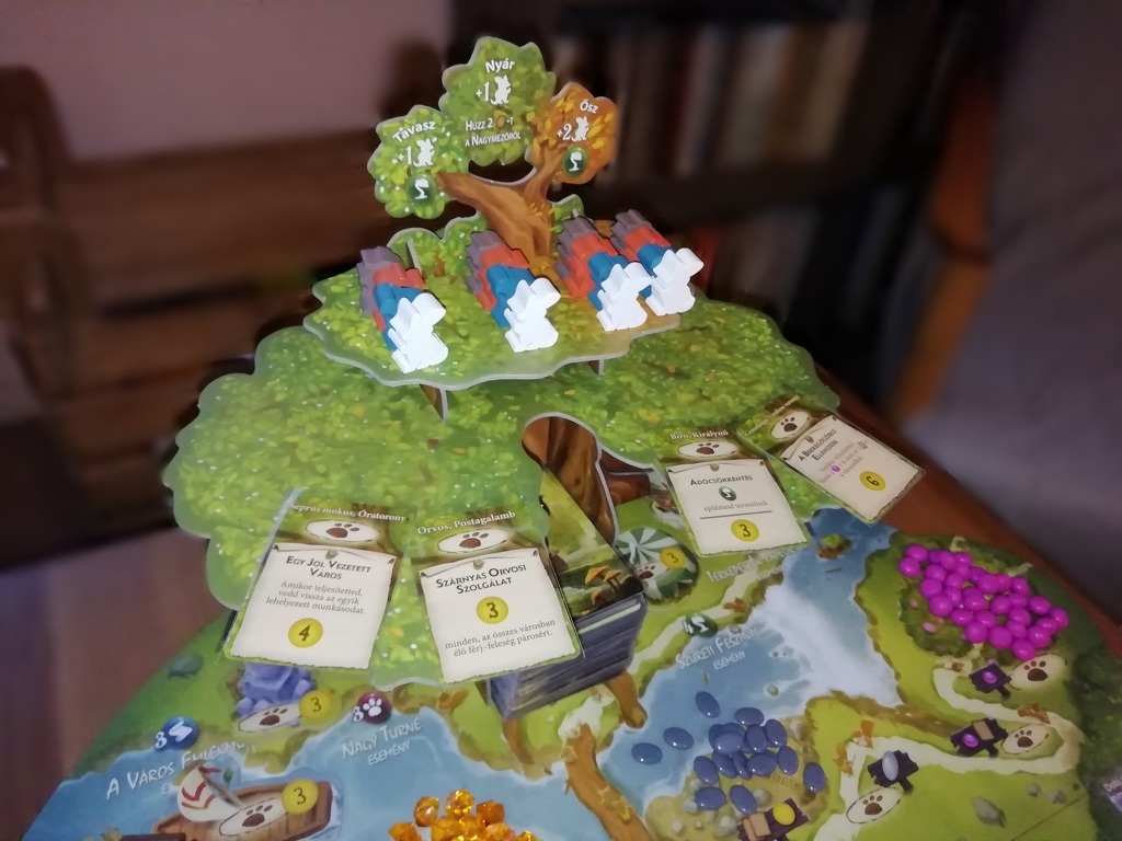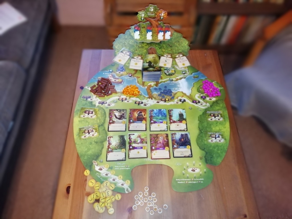 A fa inkább látványelem, de tény, hogy a 3 dimenziós játéktér sok helyet megspórol. A fa összerakásánál érdemes odafigyelni, mert az elemei nagyon nehezen csúsznak össze, sok helyen feszülnek, ráadásul a karton is elég vékony. Összerakás után érdemes a polcon helyet szorítani neki.