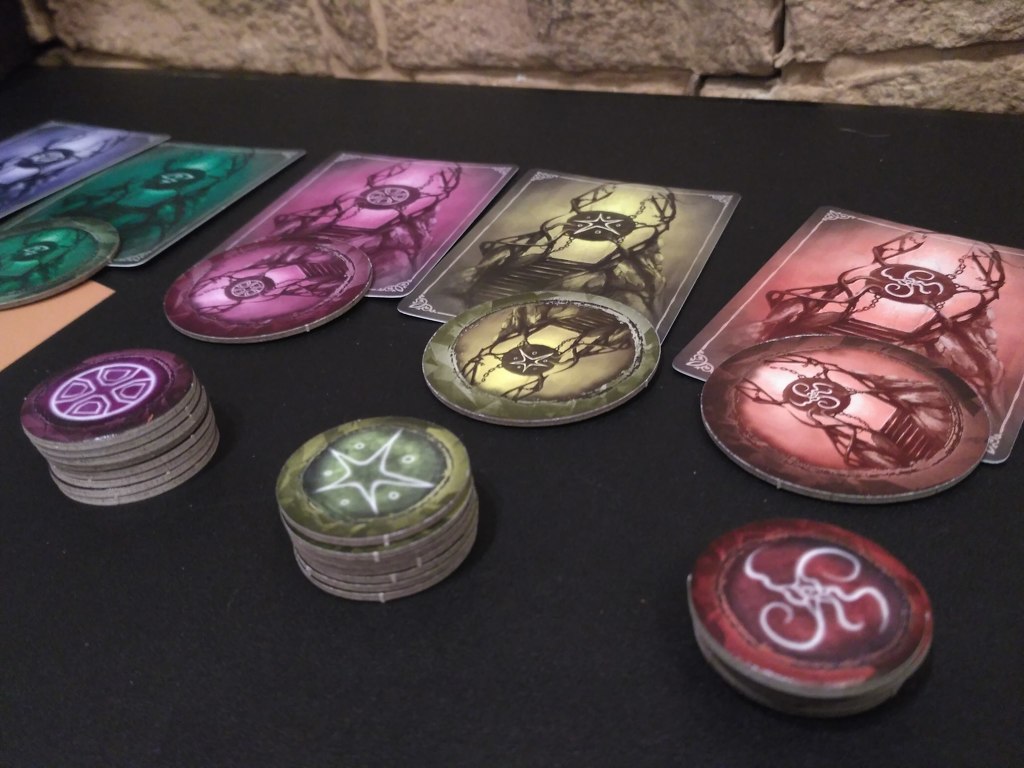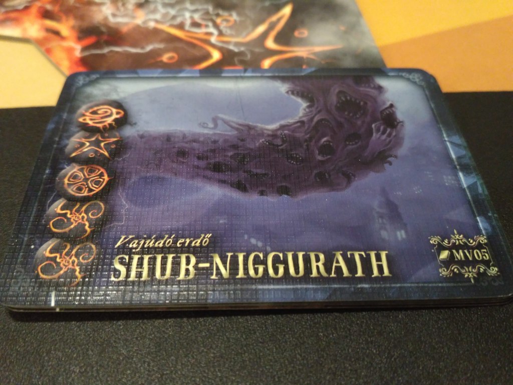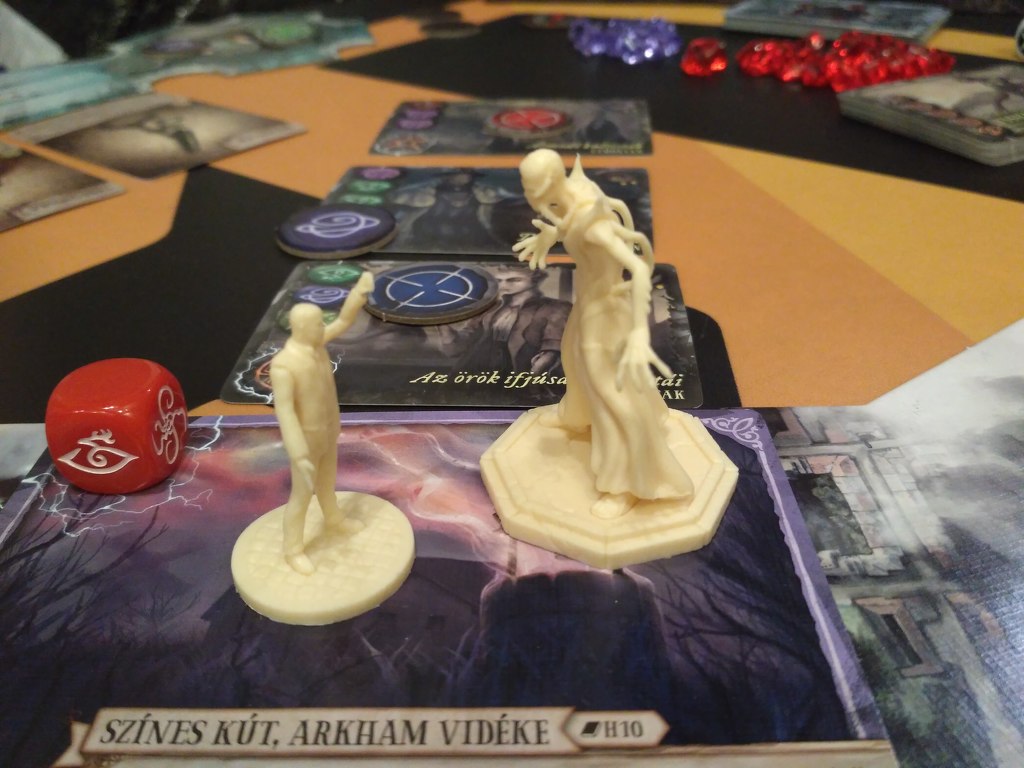 Amikor Viktor kipakolta a játékot, megállapítottam magamban, hogy a látványra itt biztosan nem lesz panasz. A tábla és a kártyák rajzstílusa jól átadja azt a sötét és őrült hangulatot, ami Lovecraft műveit jellemzi. A látvány ugyanakkor nem ment az átláthatóság rovására. A lapok elrendezésében villámok segítenek: ha minden kártyát jól raktunk le, akkor a helyszínekből kicsapó villám végigfut minden hozzá tartozó lapon és a kultistán.