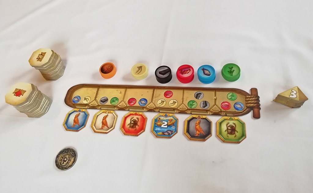 A piactáblára minden játék elején véletlenszerűen kihúzzuk az árjelzőket, ezek a játék végéig érvényesek lesznek, és ezek határozzák meg 1-1 lapka árát. Ha valaki megvett egyet, a helye üresen marad, nem töltődik fel magától. A megvásárolt lapkát magunk elé helyezzük, majd e köré „építjük” a többit. Megkülönböztetünk: állatokat (sólymot, sakált és a szkarabeuszt), sivatagokat, győzelmipontos lapkákat, raktárakat, és az írnokokat. Utóbbiak különleges képességgel rendelkeznek: amikor a raktár hozzánk kerül tárolhatunk rajta egy plusz korongot, az írnok lehelyezése után pedig a játékos egy újabb akciót hajthat végre. A lapkakombinációk egyforma, összefüggő színenként és állatonként érnek pontot, amit a játék végén számolunk össze, de ha valaki kirakott egy, a szabályoknak megfelelő 5 lapkából álló területet, bónuszként a játék közben is kap egy 3 pontot érő piramist.