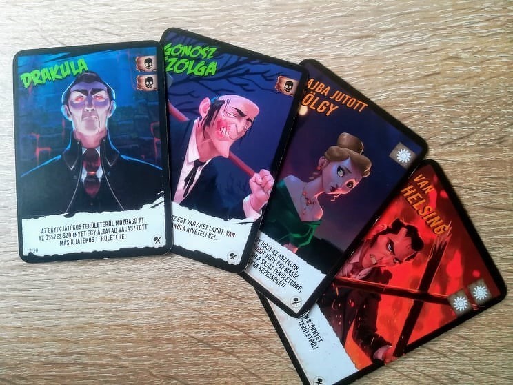 A karakterlapokat megkavarjuk, a legfelsőt felfordítjuk, ez lesz a dobópakli, a többi képpel lefelé lehelyezve pedig a húzópaklit fogja alkotni. Mindenki húz 3 lapot (mi osztani szoktunk, de ez részletkérdés). Miután megkaptuk a kezdő 3 lapunkat, megnézzük, hogy olyan karaktereket kaptunk-e, akiket nekünk gyűjteni kell. A kártyák jobb felső sarkában a napocska szimbólum a hősöket jelöli, a koponya a szörnyeket.