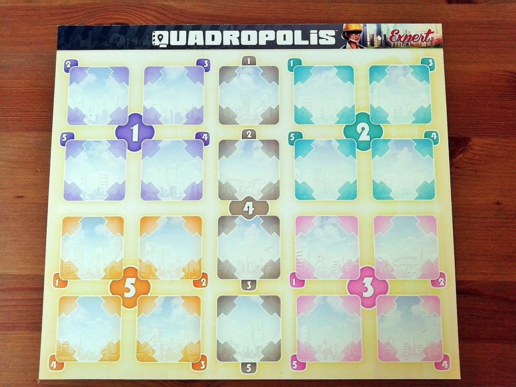 Ha már nagyon belejöttünk az építkezésekbe, kipróbálhatjuk magunkat az Expert verzióban. Ehhez meg kell fordítanunk a várostáblát. A fordulók száma négy helyett öt lesz, bejön két új épület: az irodaház és az emlékmű, a városunk pedig nem négy, hanem öt kerületből áll. Az itteni kerületek már nem egyszerűen sorokra és oszlopokra vannak osztva, hanem egy-egy parcella csoportot láttak el számmal, és azon belül a négyzeteket külön számozták.