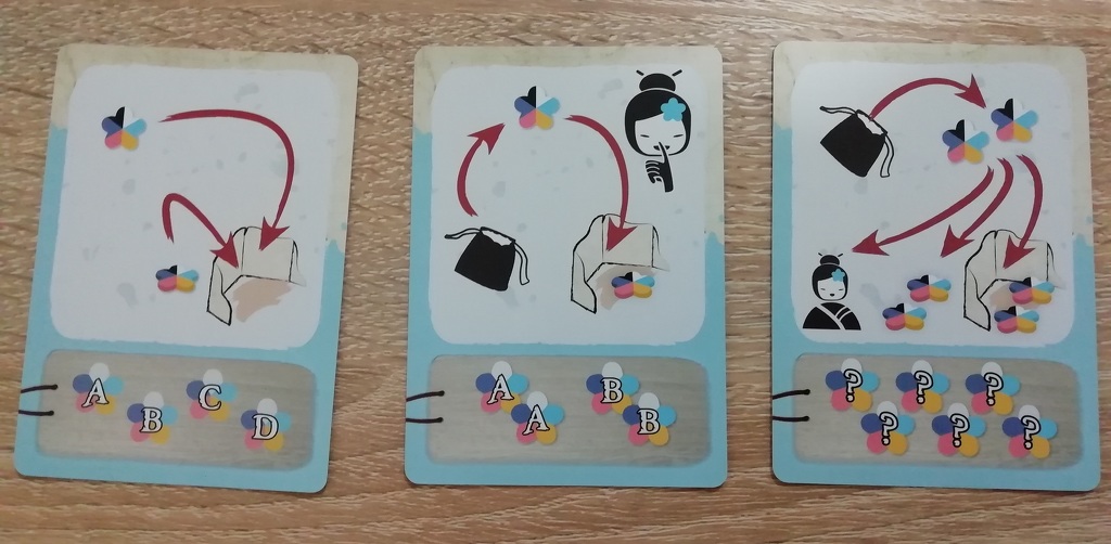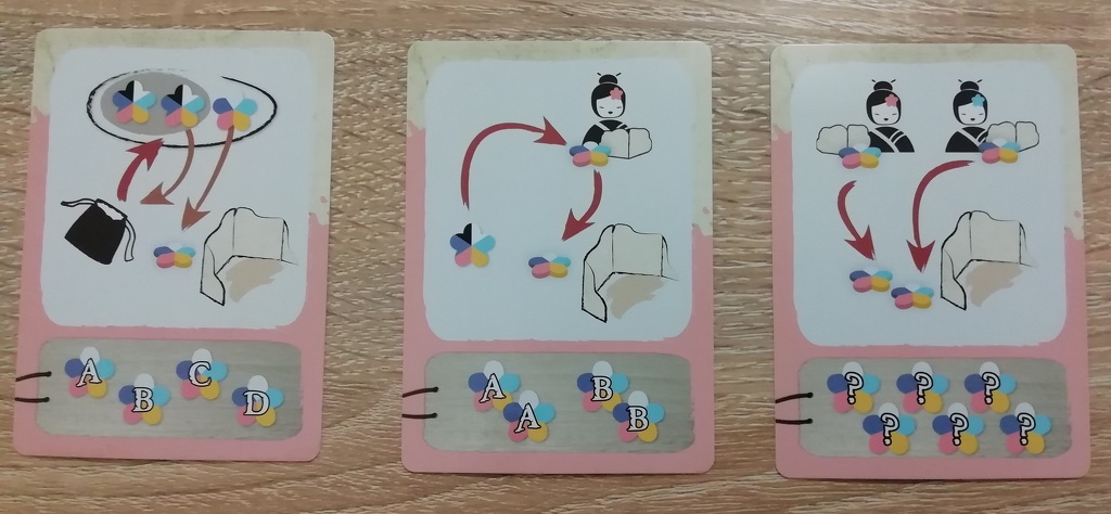 - Ha valaki 4 különböző színű virágot húz ki (a képen látható első lap), akkor a begyűjtés lezárása után újra húz 3 virágot, abból egyet kiválaszt, és a paravánja elé teszi (ez nem lehet fekete!) a többit visszahelyezi a zsákba.