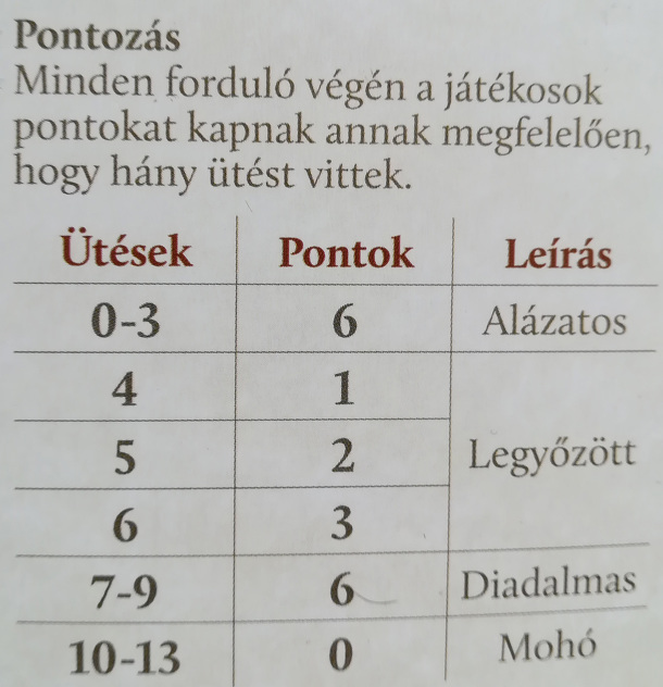 Az igazi innovációt azonban nem a különleges lapok adják a játékhoz, hanem a pontozás mikéntje. Ha valaki túl kapzsi és sok ütést visz a játékban, akkor könnyen nulla ponttal gazdagodhat, míg, ha valaki alázatosan feladja a köröket könnyen elérheti akár a hat pontot is. Így egy-egy körben fontos, hogy jól időzítsük a kijátszott lapjainkat és gyakran érdemesebb segíteni az ellenfelünket, hogy minél több pontra tegyünk szert a fordulókban. Ha megvagyunk a pontozással, akkor pedig új fordulót kezdünk, ez egészen addig tart, amíg valaki össze nem szed minimum 21 pontot. A játékot az nyeri, akinek a legtöbb pontja van.