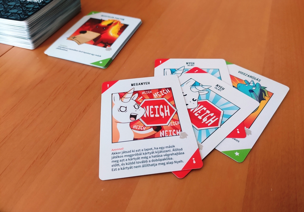 - Azonnali kártyák: ezek nem csak a saját körünkben kijátszhatóak. Ide tartoznak például a Nyeh kártyák is, melyekkel más játékosok akcióit tudjuk megakadályozni. Nehogy már másnak több unikornisa legyen, mint neked...