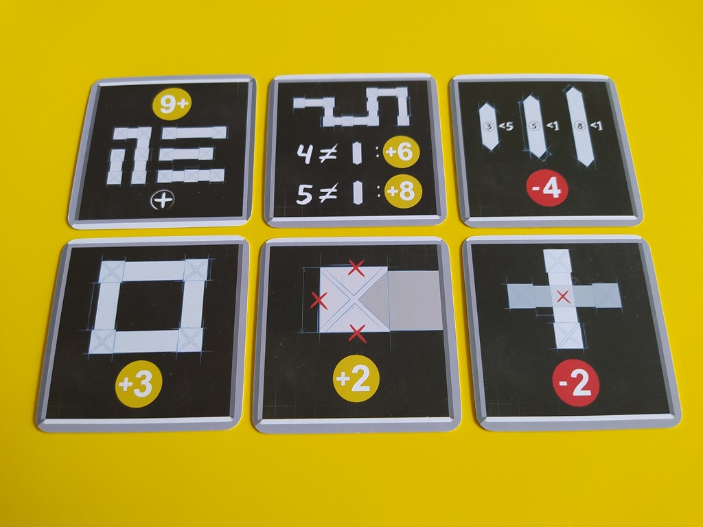 Mint említettem, a Felhőváros nagyon egyszerű játék. Láthatták ezt a készítők is, ezért a gamerek kedvéért gyorsan mellékeltek néhány különleges igény lapkát a dobozba. Ezek egyfajta célkártyák, amik extra pontokat, illetve pontlevonást adhatnak. Van olyan, ahol nem építhetünk utakat egymás fölé, van, ahol adott számú épületet kell felhúznunk, és persze a klasszikus, leghosszabb útért folyó verseny is megjelenik. A készítők ezt a lehetőséget haladó módnak nevezik, és egy vagy két kártya felhúzását javasolják a játékosoknak. Én azt mondom, hogy ha nem ez az első társas, amit életetekben játszotok, akkor nyugodtan dobjatok be két kártyát már az első partira is.