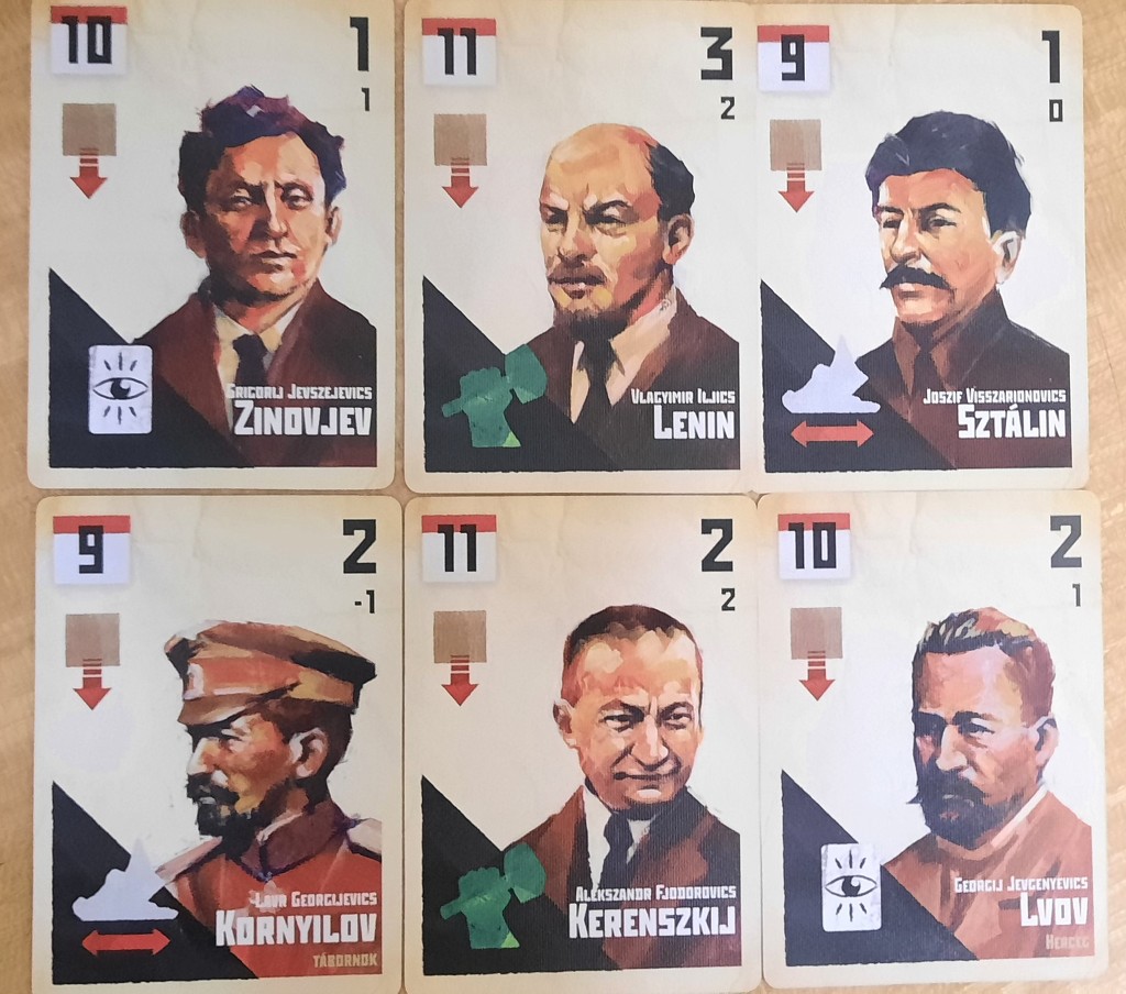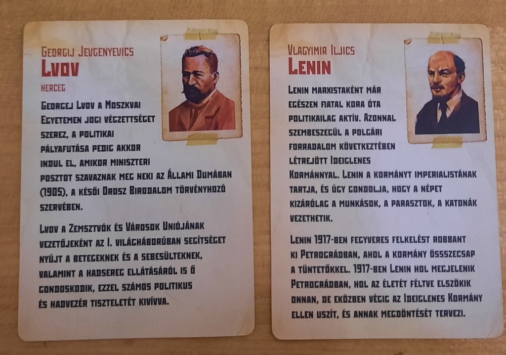 Minden kártyán van egy kis idézet a kor szereplőitől, legyenek azok közismert személyek (pl. a cárné, Lenin) vagy a legkisebbek (gyári munkásnő visszaemlékezése), ez jóalap hangulatot tud adni a játékhoz - bár szerintem játékközben ritkán olvasgatja az ember. Ezen felül vannak kis plusz kártyák is, amik a játékhoz nem kellenek, ezek a játékban szereplő valós „vezetők” rövid életrajzával vannak kitöltve, az eseményekre fókuszálva, így a valós szerepük is megismerhető, továbbá van egy lap egy rövid táblázatocskával a valós eseményfolyam dátumairól. Ezek mind elhagyhatók lennének a játékmenet szempontjából, a meglétük mégis hatalmas plusz szerintem, nagy igényességre vall. (Nem utolsó sorban töri dolgozatra felkészülésben is segítséget nyújthatnak ezek a lapkák, ugyanis tömören adnak át sok fontos információt.) Tehát a játék nem vár el „történelmi előtudást”, viszont ad, de csak akkor, ha kérjük is, nem pedig arcbunkba tolva.