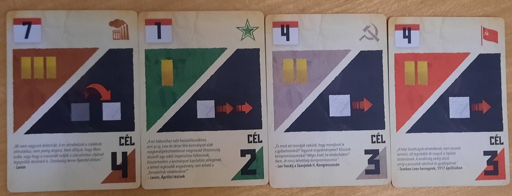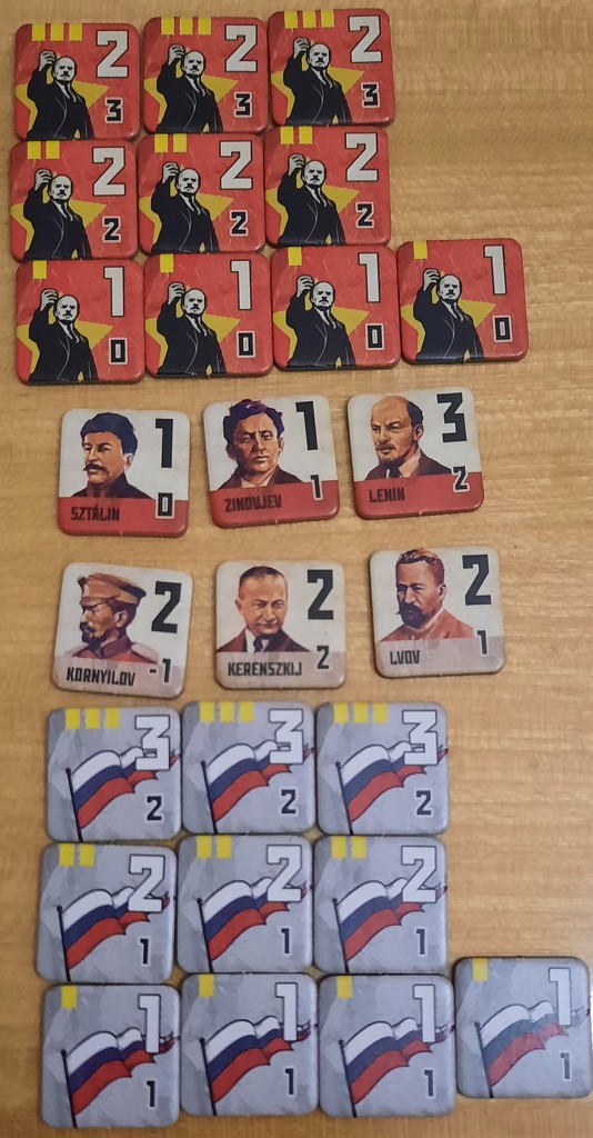 A lapok felső sarkában levő kis naptárlapra írt számocska nagyon fontos, ugyanis annyit kell lépni a naptáron, amekkora számot ott találunk. Ez azért fontos mert bizony az elmúló napok számával is matekozhatunk, ugyanis amelyik játékos átlép a következő hónapba, az kapja meg a népakarat jelölőt, aki pedig 15.-ére vagy 29-30-31.-ére lép, egy bónusz akciót is végrehajthat. Így bizony néha az alapján választunk lapot, hogy épp hová lépünk a naptárban és csak másodlagos a lap képessége. Egyébként alap esetben a lapunk kijátszása révén vagy a lap által mutatott egységet helyezünk fel az adott színű területre, vagy pedig a lap alsó felében látható akciót alkalmazzuk, ami lehet egység mozgatás, egységmozgatás kettő területnyi távra vagy egység pihentetés. Ez utóbbi egy kifáradt oldalán levő lapka megfordítását jelenti, ugyanis a csatározás után a lapkákon fordítunk egyet, a következő után pedig levesszük a kifáradt, felmorzsolódott csapataink, így a visszafordításuk 1: erősít alapesetben rajtuk (bár ez nem mindegyiknél van így, a vörösöknél egyes egységek „kifáradt” oldala erősebb) 2: egy körrel tovább tartja bent a területen őket. A levett alaplapkáink egyébként visszakerülnek a készleteinkbe, a semleges és a vezetőjelölők pedig kikerülnek a játékból. Visszatérve a naptárhoz, még egy fontos adalék van, a megfelelő hónapnál megjelenik a semleges Trockij, akit a népakarat jelölős játékos irányít, majd később vörössé változik, ekkor a vörös játékosé mindenképp, ha még mindig a táblán van, mert az is lehet, hogy már lekerült onnan.