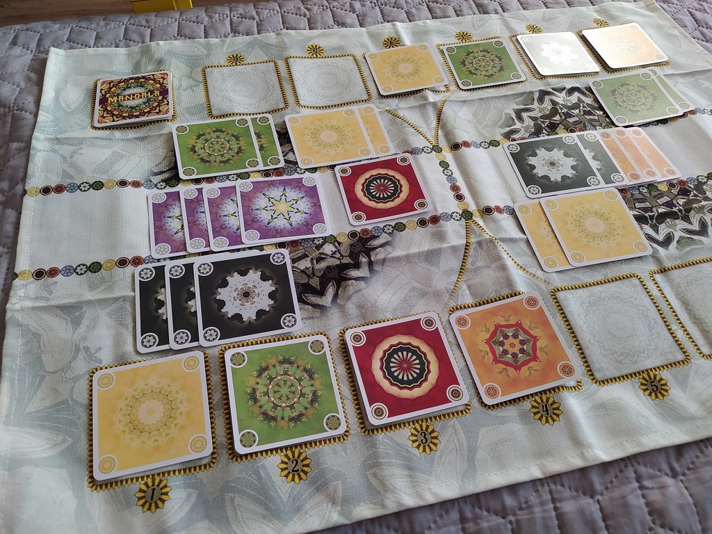 Bevallom, többször is el kellett olvasnom a szabályt, és legalább két partit le kellett játszanom, mire rájöttem, hogy mennyire okosan megtervezett játék a Mandala, és, hogy milyen sok taktikai lehetőséget rejt magában. A hegyek építése amellett, hogy folyamatos számolást igényel, egy állandó pszicho-párbaj is egyben. Ha már nagyon közel vagyunk a befejezéshez, végzetes hiba lehet kijátszani az utolsó előtti színt, hiszen a másik bármikor elviheti a legjobb lapokat az utolsó kártya kijátszásával. Ellenben bővíthetjük úgy a hegy közös részét, hogy hiába választ elsőként a másik, mi mindenképpen jól járunk. Ilyenkor az ellenfelünk pontszerzés helyett a veszteségmenedzsmenten fog gondolkodni, mi pedig koncentrálhatunk a másik hegyre.