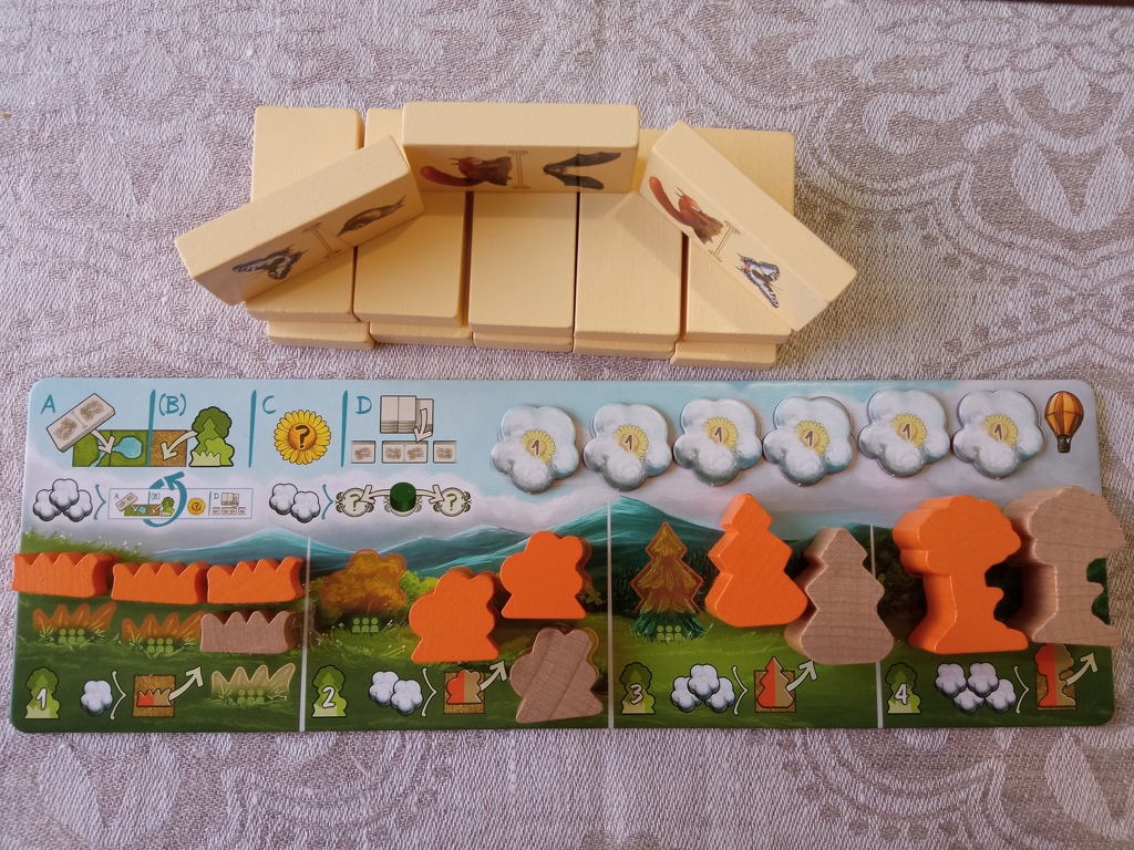 Minden játékosnak van egy saját táblája, saját és semleges színű növényjelzőkkel (gyep, bokor, fenyő, tölgy). A játékosok számától függően kapunk állatokkal illusztrált dominókat, melyeket képpel lefelé magunk elé kell helyeznünk. Mindig csak három darab lehet felfordítva, és a saját dominóinkat csak mi láthatjuk.