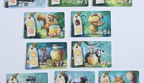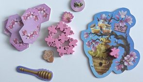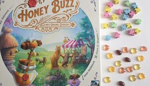Ritkán nyúlok angol nyelvű játék után, de ez a csodaszép grafika, a pasztell színű fa méhecskék és a gumiszerű mézek levettek a lábamról – nem véletlen kapott a Honey Buzz 2020-ban Golden Geek Awards díj jelölést Legjobb grafika/prezentáció kategóriában. Egyedül a szabály, a játékossegédlet és a küzdelem kártyák nyelvfüggőek, de az előbbi kettőből találunk magyar verziót az interneten, az utóbbi pedig csak pár szóból áll, gyengébb angol tudással is megérthető.