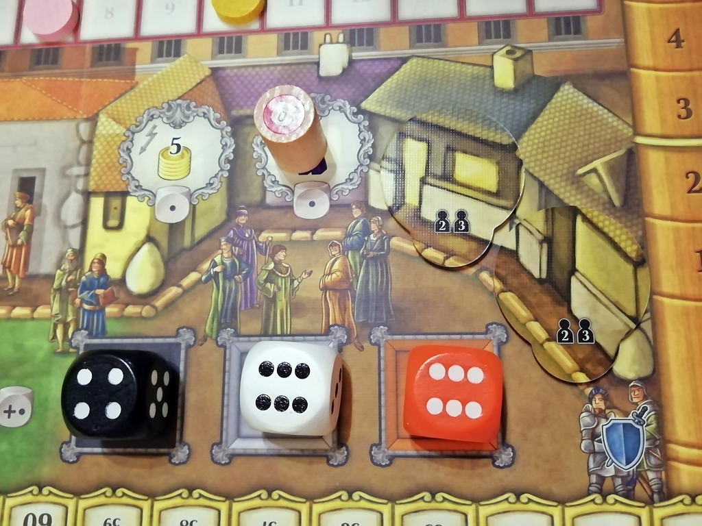 A játéktábla még további három helyszínt tartogat. A piacra legalább egyes értékű munkással valamilyen még szabad jutalmat választhatunk, a tanács palotája egy közös akcióhely, ahova bárki bármennyi munkásával betérhet és valamilyen bónuszt választhat.