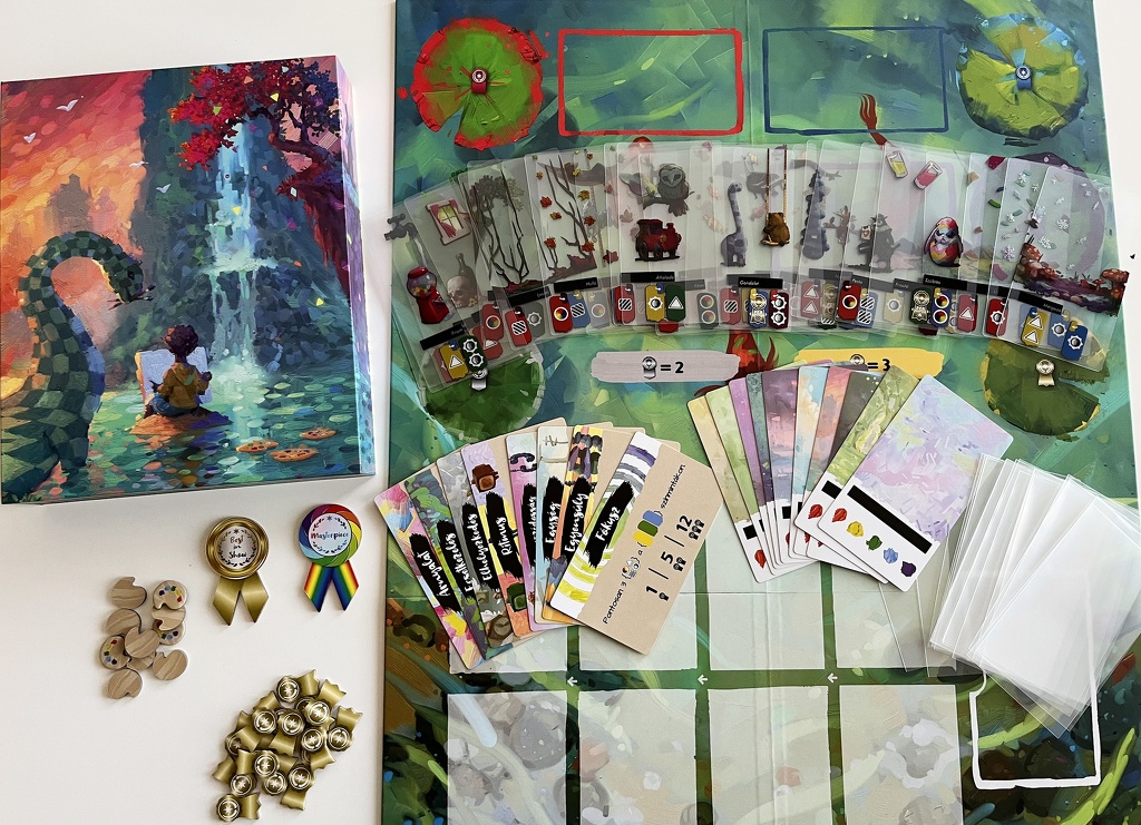 Bár a játék stílusához illik az alapjáték vászonja, én nagyon örülök, hogy a kiegészítő lecseréli egy játékostáblára. Azon túl, hogy praktikusabb, kényelmesebb és látványosabb verziót kapunk, a felépítés is változik. A festménykártya-kínálat két sorra bővült, így öt helyett már nyolc lapból válaszhtunk. A húzópaklitól legtávolabbi két lap ingyenes, de a többi kifizetésénél az első és a második sorba is le kell helyeznünk az inspirációjelölőinket a választott oszlop előtti kártyákra. Hogy elég jelölőnk legyen a szimpatikus kártyák megszerzéséhez, a játékot négy helyett hattal kezdjük.