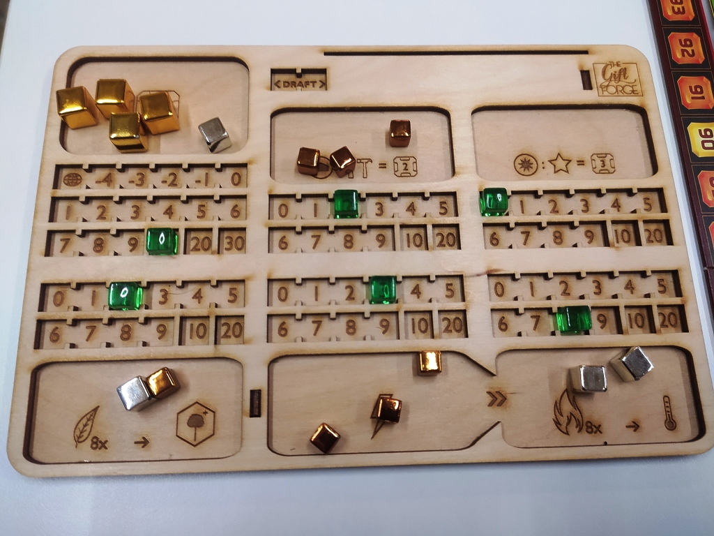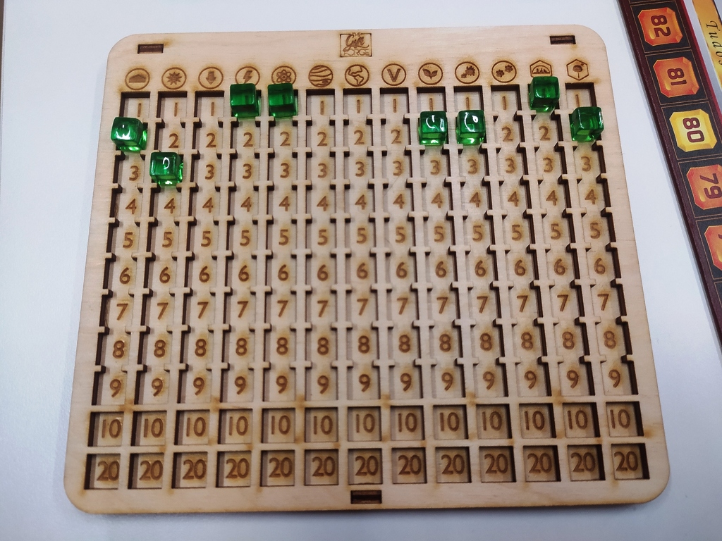 Erre nyújt páratlan megoldást a mélyedésekkel bőségesen ellátott fa játékostábla. A termelési sávok összes száma külön vájattal rendelkezik, a birtokunkban lévő erőforrásoknak is külön szekciók vannak létrehozva, és az eredeti játékostáblákhoz hasonlóan itt is megtalálhatjuk az olyan jellegű emlékeztetőket, mint például az acél, a titán, a palánta, valamint a hő felhasználási módja. Ezen kívül az energia és a hő mélyedése össze van nyitva, hogy egyszerűbb legyen az energiát hővé alakítani a generációk végén. Sőt, ha ez nem volna elég, a termelési sávokon találkozhatunk 20-as, illetve 30-as értékekkel is, hogy ne sok kockát kelljen a legalább 20-as termelésekhez felhalmozni.