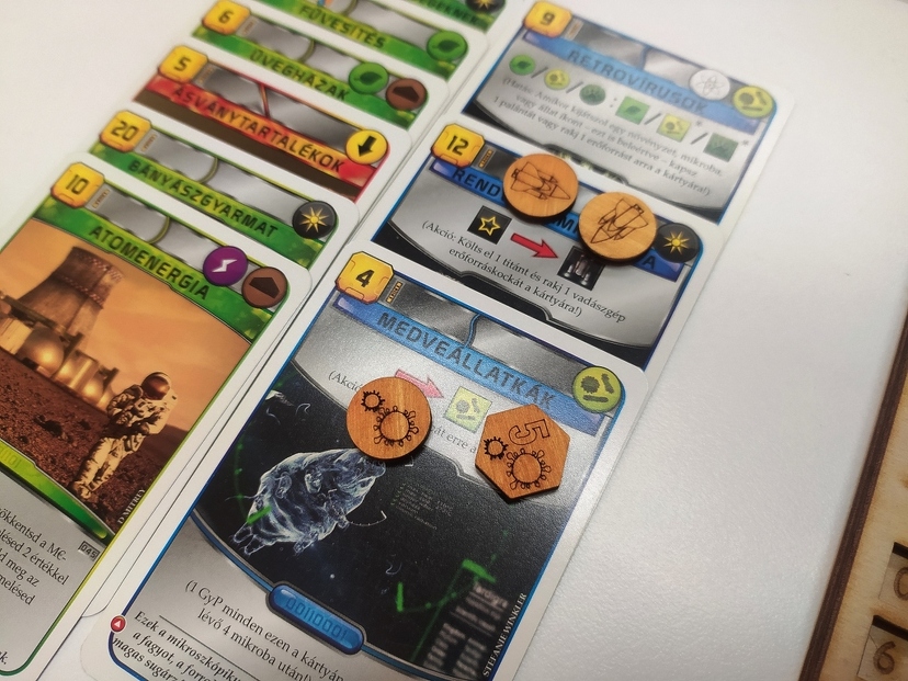 Kissé egyhangúvá válhat, ha ugyanazzal jelöljük a megakredit készletünket, az állatainkat és a lebegőinket is. A kis kerek és hatszögletű tokenek segítségével végre mindennek meglesz a maga jelölője - legalábbis a projektkártyáinkon.