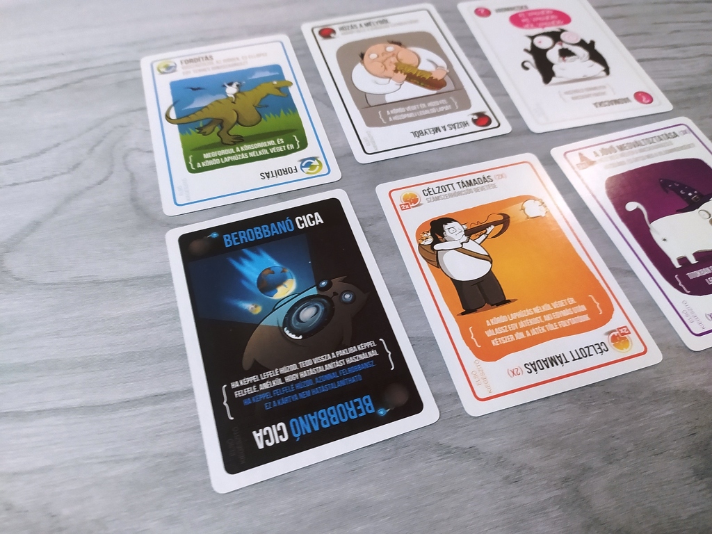 A Berobbanó cicák érdekes taktikai lehetőségeket hoz be a játékba az új kártyákkal. Ettől függetlenül ugyanúgy aknára léphetünk egy óvatlan pillanatban, ahogyan eddig is, de szerintem ez egy ilyen kaliberű játéknál ugyanakkora előny, amekkora hátrány. Sőt, a potenciális vásárlók körében valószínűleg az sem hátrány, hogy az új lapok újabb vicces grafikákat és szövegeket jelentenek.