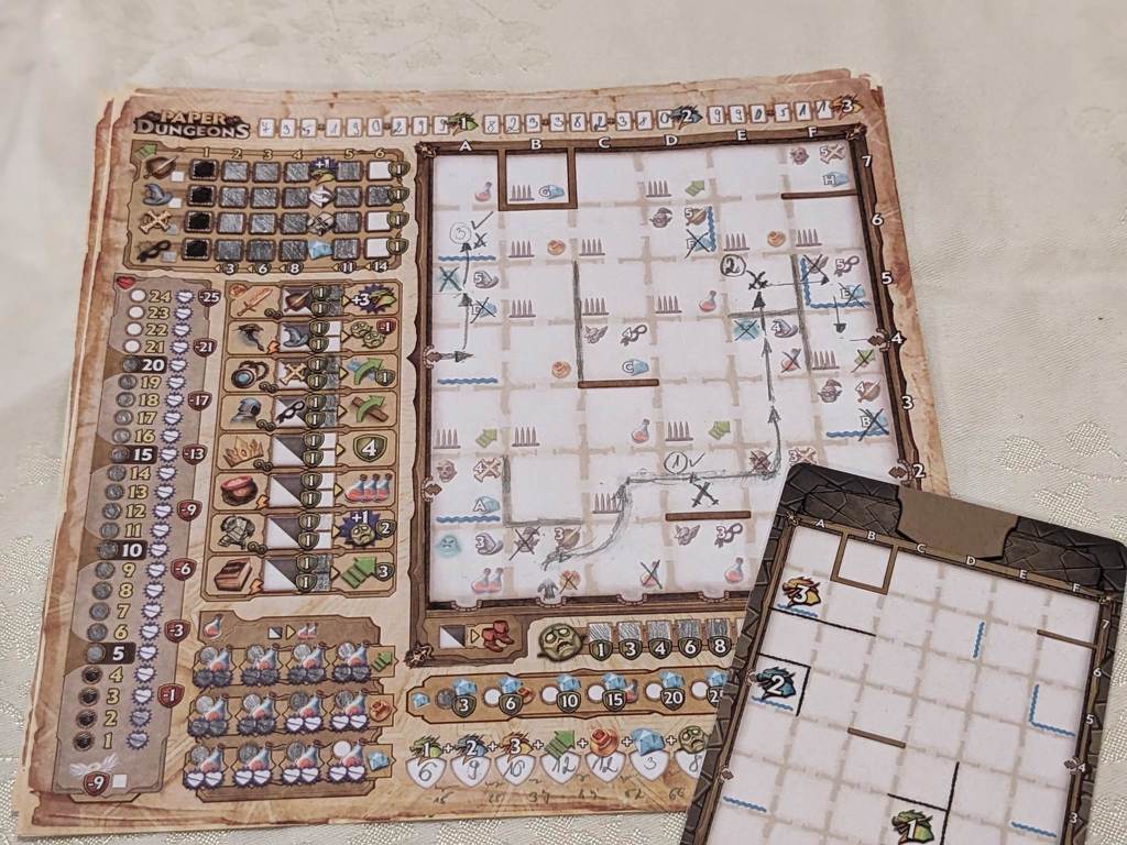 Ha kikészülődtük magunkat, akkor szintén kockák elköltésével útnak indulhatunk a papír jobb oldalán látható dungeonba. Itt mezőről mezőre haladva gyűjthetjük a kincseket, amik rendszerint valamilyen ingyenes akciót jelentenek (pl. kocka felhasználása nélkül készíthetünk varázsfőzetet), vagy pontot érnek a játék végén. Ezen kívül léphetünk csapdába – ami természetesen életerő veszteséggel jár -, és összefuthatunk szörnyekkel is. Ezek mellett mindig egy kis ikon mutatja, hogy milyen kasztú és mekkora szintű kalandozó szükséges a legyőzésükhöz. Helyesebben: legyőzni mindenképpen sikerül (ez lenne az automatikus harc), de ha nem volt velünk a kívánt erejű hős, annyi életpontot veszít a csapat, amennyi a követelményhez hiányzott.