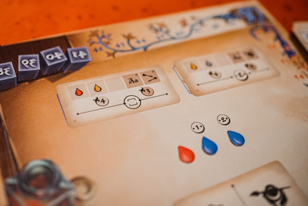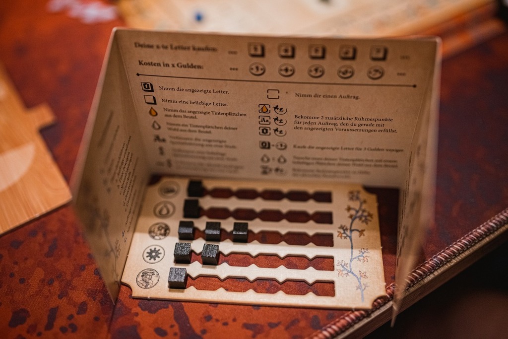 Amint látjuk ezek az akcióhelyek mindegyike a szerződések teljesítését segíti elő valahogy. Egyedül betűket nem ad, de azt a körünk alatt bármikor vásárolhatunk. Minél több betűvel rendelkezünk, annál mélyebbre kell nyúlni a zsebünkbe, mert minden vásárolt betű ára annyi ahányadik betűnk lesz a készletünkben. Azaz, ha 5 betűnk van a következő 6 pénzbe fog nekünk fájni. Pénzt pedig vajon mivel szerzünk? Így van, szerződések teljesítésével. Na de vissza az akciókhoz. Mivel a táblán levő tinták, kártyák száma megegyezik a játékosok számával, a Gutenberg a „Vedd el a másik elől” gondolatmenettel dolgozik. Kapunk egy akcióválasztó táblát, amit egy paraván mögött úgynevezett kezdeményezésjelölőkkel töltünk ki. A kezdőjátékos 7 darab jelölővel kezd, ebből játékossorrendben haladva, mindenki egyel többet kap, mint az előtte lévő. Az akciótáblán az 5 akció szerepel, a kör elején a jelölőket titokban szétosztjuk közöttük. Miután mindenki kész, a táblát felfedjük és sorban végig megyünk rajtuk. Aki a legtöbb jelölőt pakolta az adott akció mellé, az kezdi a választást. A döntetlenek játékossorrendben dőlnek el, tehát a kezdőjátékosnak hiába van kevesebb kockája, minden döntetlen, amiben szerepel, az ő javára dől el. Ez így megy 6 fordulón keresztül, a végén pedig a legtöbb pontot szerző játékos nyer. A játékmenetet megfűszerezik az egyedi játékosképességek is, amit a szabály csak haladó játékhoz ajánl, de én azt mondom, bátran tegyük bele őket akár az első játéknál is. Sokat nem bonyolít, csupán mindenkinek lesz valamilyen különleges és hasznos képessége. Például, amikor felfedjük az akcióválasztó táblát, egy kockát átmozgathatunk bárhova, elnyerve ezzel a kezdeményezést egy kritikus helyen.