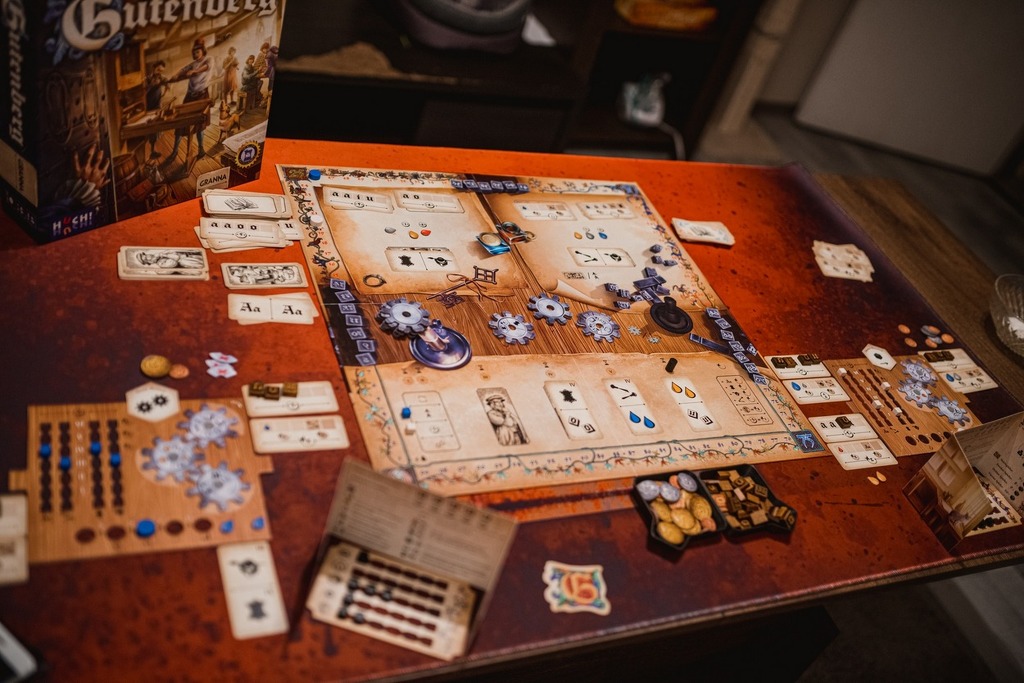 Ez is egy érdekes pont. A BGG 3-4 főre ajánlja lefőképp, mégis kiemelném a kétjátékos változatot. A tábla kétoldalú, az egyik 3-4 főre a másik kettőre van kalibrálva. Több játékossal azt a hangulatos versenyt adja, ami a szabályokból is kiderül. Viszont két játékossal nekem valamivel intenzívebb volt az élmény. Játékosszámtól függően kerülnek fel az elvihető elemek, így több játékosnál könnyebben el tudtam engedni dolgokat. Nagyobb a „piac”, így nem bántam annyira, ha nem én választok elsőnek, megleszek abból is, ami marad. Ezáltal a kezdeményezésjelölőket sem pazaroltam el feleslegesen. Két játékosnál viszont mindenből csak kettő van. Az egyik a tied a másik az enyém, és pont. Itt, ha az egyik nem szolgálja a terveid, nem sok választásod van. Elengedjem? Menjek rá több jelölővel, de akkor máshova meg nem jut és onnan a lepattanóról is lemaradok? Ezek a dilemmák persze a többi játékosszámnál is előtörnek, de itt nekem valahogy szűkebbnek hatott a dolog és a tervezési fázisban erőteljesebbé vált a halántékmasszírozás. A kezdőjátékos szerepe nekem sokkal feszültebb pillanatokat hozott. Egyetlen hátránya, a tábla a sok üresen maradt felület miatt nagyon szegényesnek hat. Persze nagyobb játékosszámmal a Gutenberg is jobban domborít, többedmagunkkal mindig mókásabb az interakció.