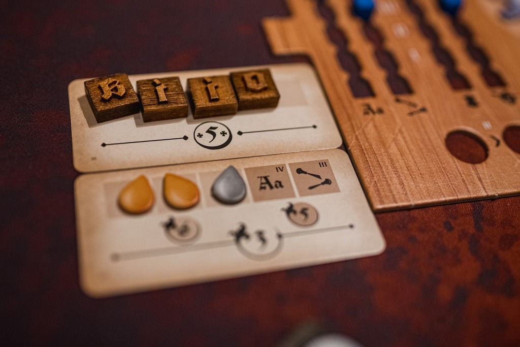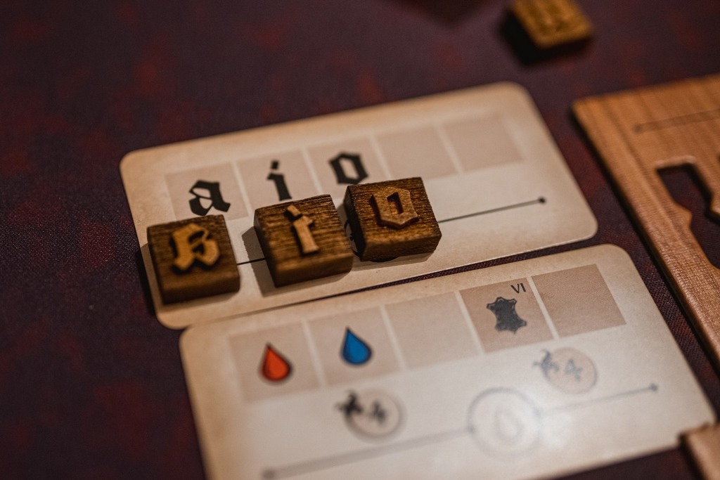 Itt viszont nem nagyon van mibe belekötni. Már a borítón lévő grafika is egészen áll-leejtő minőséget képvisel. És bár a beltartalom ezzel szemben kicsit kontrasztban van a rengeteg fa textúra használatától, de az 1400-as évek gyerekcipőben járó nyomdász műhelyeinek a világát egész hangulatosan visszaadja. A kártyák és a tábla grafikái is ezen a nyomon maradva minimalista, de a kor jellemzőit hűen tükröző megoldásait elevenítik fel. Ha valamin, akkor a téma ezen szépen megáll. A komponensek is rendben vannak, a kartonelemek elég vastagok, bár a játékostábla és az akcióválasztó tábla picit talán lehetne masszívabb. A kártyák átlagos minőségűek, és ez csak azért szomorú, mert a méretükre ez legkevésbé sem mondható el. Aki védőzni szeretné, nos annak sok sikert a pont rájuk passzoló méret beszerzéséhez. A játékelemek közül magasan kiemelkednek a fa betűnyomó elemek. Ezeken látszik a minőségi munka és kinézetre is egészen remekre sikerültek. - Bár az asztalnál volt egy kis diskurzus arról, hogy ha helyettük kartonlapkák lennének, ellenben 5-6 ezredessel olcsóbb lenne a játék, vajon melyik verziót választanánk? - Végül mindenképp meg kell említenem a kis dobozkákat, ami a játékalkatrészek és kártyák tárolására készültek. Ritkán látni ilyesmit és én üdvözítem az ehhez hasonló dolgokat. Segít a ki és bepakolásnál, teljesen elhagyja a zacskózást, és a doboz tartalma sem fog kiömleni, összekeveredni. Nem utolsó sorban esztétikus is.