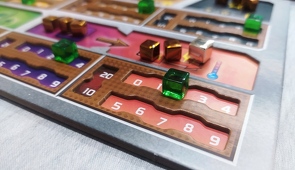 Elsőként vessünk egy pillantást az újraálmodott játékostáblákra. Mint emlékezhetünk, az alapjátékban lévő kartonlapokkal csak a baj van: a jelölők össze-vissza csúszkálnak a legkisebb mozgástól, illetve egy komolyabb figyelmetlenség esetén vakarhatjuk a fejünket, hogy mégis mi hol volt. Ezt egy kétrétegű, szekcionált verzióval igyekeztek orvosolni. A termelési sávokon minden hely elcsúsztatva van a szomszédos helyekhez képest, valamint a meglévő erőforrások is kaptak különválasztott tárolhelyet típusonként.