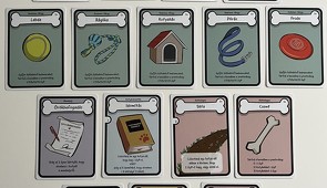 Egy elvett kártyán lehet kutya, étel, séta, idomítás, tulajdonság, örökbefogadás, kedvenc tárgy vagy csont. Hogyha kutyust vettünk el, magunk elé rakjuk az új kiskedvencünk. Minden kutyának van mérete (kicsi, közepes vagy nagy), neve és vacsora-kívánsága, és a játék során rendelhetünk hozzá egy tulajdonság-, egy séta- és egy idomítás-kártyát.