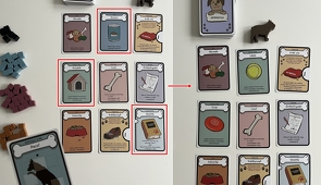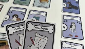 Kettő örökbefogadás-kártya eldobásával örökbe fogadhatunk egy kutyust a menhelyről – a kiválasztott ebet magunk elé rakjuk, majd újra háromra bővítjük a kínálatot.