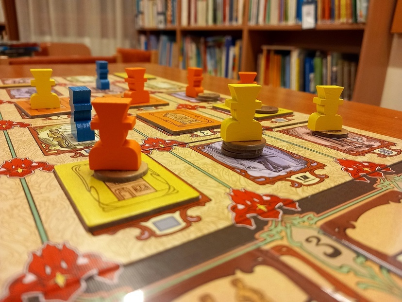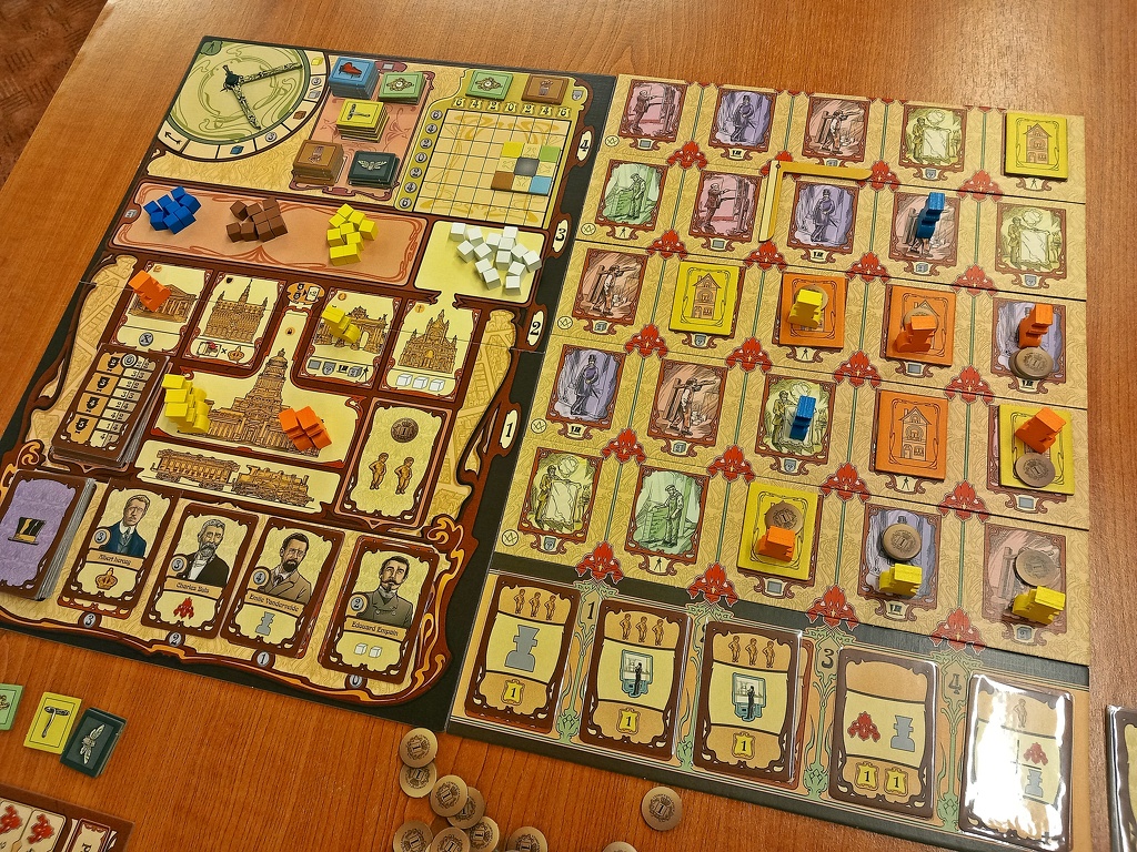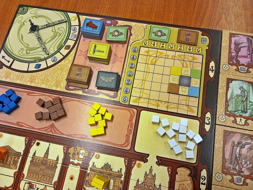 A szecesszió táblán ötféle akciót találsz, az építést, alkotást, értékesítést, befolyásolást, és az anyagbeszerzést. Az aktív táblarészt mindig a tőzsdekártyák határozzák meg és egy vinklivel kell kijelölni. Ezen belül rakhatjátok le munkásaitokat.