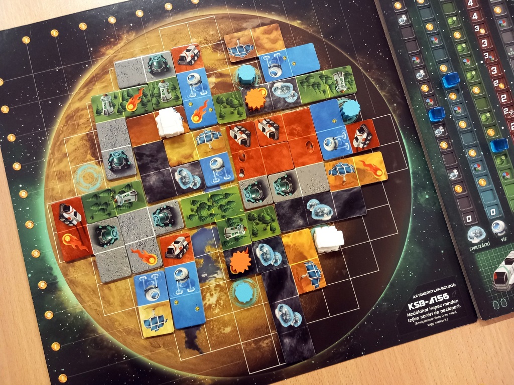 És a térkép az egyetlen dolog ami hasonló. Nekem mind a kettő meg van, hidd el tudom. Néz meg róla egy videót, van bőven. Tetrisz alakzatokkal kell különböző módon, tele pakolni a bolygót. Nem mindegy milyen színű egyes részei az alakzatnak, az alapján haladsz 4 különbözö sávon. Minden sort és oszlopot is be kell fejezni, csak akkor ér pontot. Plusz vannak CV kártyák amik pluszt adnak. Vannak még bázisok, meteoritok, amiket Roverekkel lehet össze szedni. Nagyából ennyi, biztos van még pár dolog, de így már lehet tájolni.