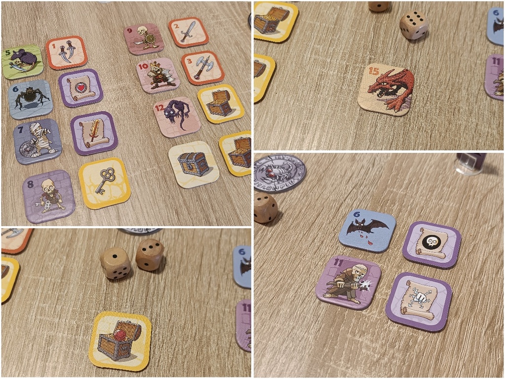 Nem kertelek az első találkozásom a Karakkal pocsék élmény volt. Egy klubnapon próbáltam ki és nem kedvezett nekem a szerencse, még a legkisebb értékű szörnyet sem tudtam legyőzni, így esélyem sem volt a többiekkel szemben. Nagyjából minden köröm a kudarcról szólt, míg a játékostársak sorra gyűjtötték a fegyvereket, kincseket, varázstárgyakat. El is könyveltem magamban, hogy ez a játék nem jöhet haza, mert ha a fiamnak lesz ekkora balszerencséje, biztos, hogy megutálja nem csak a játékot, de az egész társasjátékozást. Simán előfordulhat, hogy az egyik játékos vért izzad, hogy kidobja két kockával a hatos értékű pókot, míg a másik sorra dobja meg a kilences értékűeket, és lazán konstatálja, hogy nem nagy cucc ez a játék.