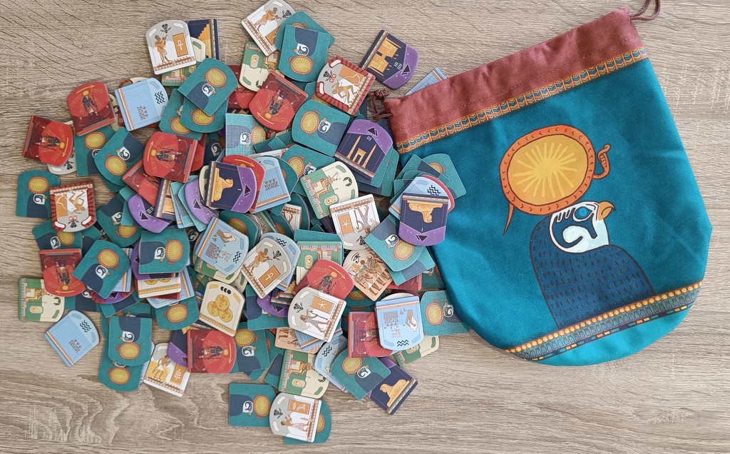 Hét típusú lapka található a húzózsákban, ezek közül hatért mind a három korszak végén pontot kapunk. Az emlékművek az egyedüliek, amit csak a játék végén pontozunk és belőlük szetteket kell gyűjtenünk, minél több különbözőt vagy egyformát. A fáraók esetén többségre gyúrunk: meg kell vizsgálni kinek van a legtöbb és legkevesebb lapkája. A Nílus lapkák egy pontot érnek, de csak akkor, ha a másik oldalra sikerült legalább egy áradás lapkát szereznünk. Ez a három lapkatípus az, amik egészen a játék végéig nálunk maradnak. Az istenséglapkák 2 pontot érnek, elköltésükkel pedig elvehetünk egy szabadon választott lapkát az árveréssávról. Az aranylapkákért 3 győzelmi pontot kapunk. A civilizációlapkáknál a sokszínűségre törekszünk, minél több különbözőt kell gyűjtenünk. Az áradáslapkákért 1 pontot kapunk és általuk pontozhatjuk le a Nílus lapkákat.