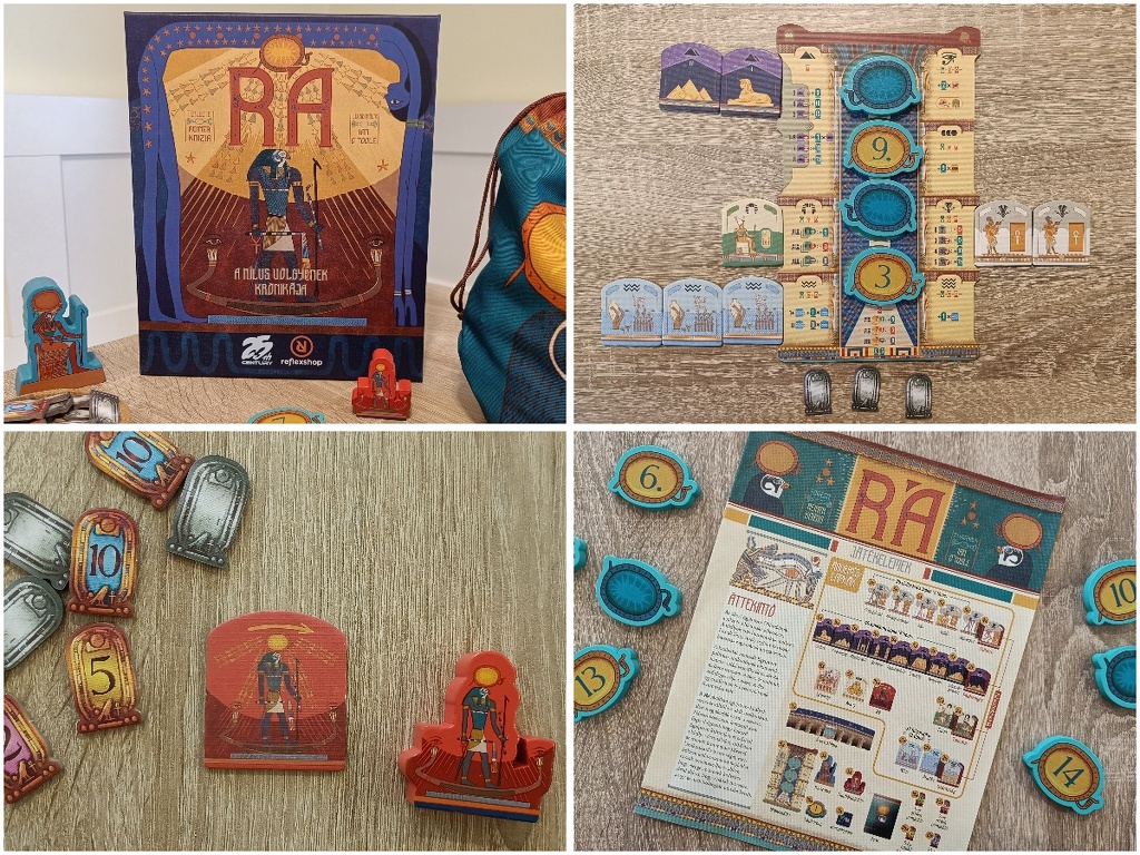A Rá: A Nílus völgyének krónikája társasjátékban egy olyan libikókára ülünk fel, amit folyamatosan egyensúlyban kell tartanunk. Egyik lapkatípus gyűjtgetését se hanyagolhatjuk el, különben nagyon lemaradunk a pontszerzésben. Az első döntés, hogy mikor érdemes beszállni egy licitbe. A licittel megnyerhető lapkákon felül, arra is érdemes figyelni, hogy melyik napkorongot áldozzuk be és melyiket kapjuk meg cserébe. Kemény számolgatások és esélylatolgatások cikáznak a fejekben. Érdemes-e egy jónak tűnő szettet megszerezni, ha azokkal egy hármas értékű koronghoz jutok? Hiszen a következő korszakban, akkor nagyon gyenge értékkel szállhatok be az árverésbe. Majd átpillantok a többi játékos táblájára, hogy ők mit veszítenek vagy mekkorát kaszálnak. Ráadásnak ott van még a titkosan kezelt győzelmi pont is, ami végig kiélezi a játékot, és csak a végén derül ki, hogy ki mennyire volt sikeres. Ezen döntések meghozatalának súlyos ára lehet, ezért is javasolják a játékot 12 éves kor feletti fáraók számára.