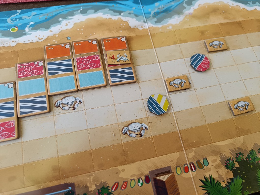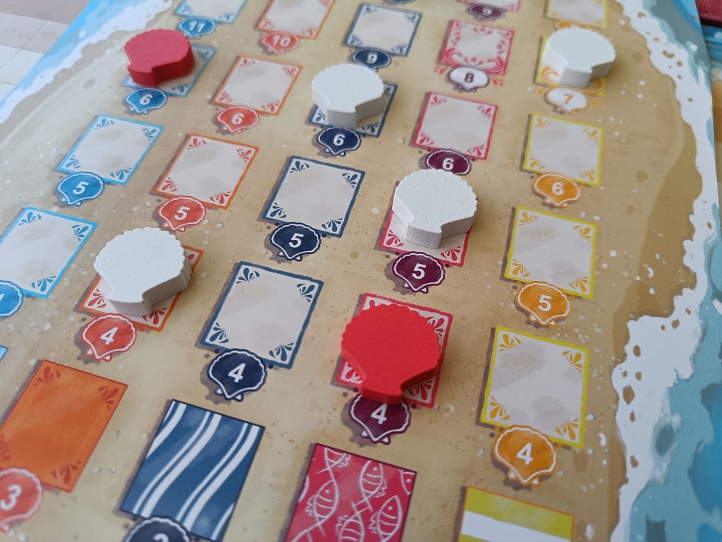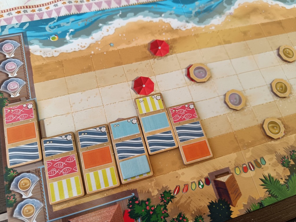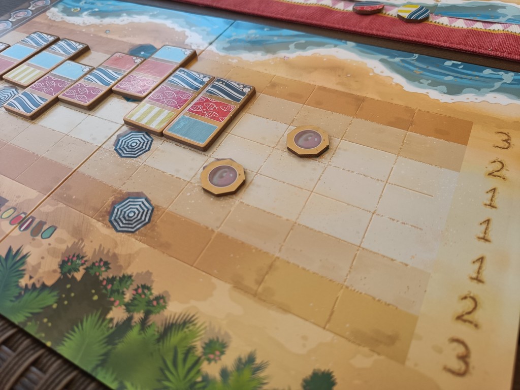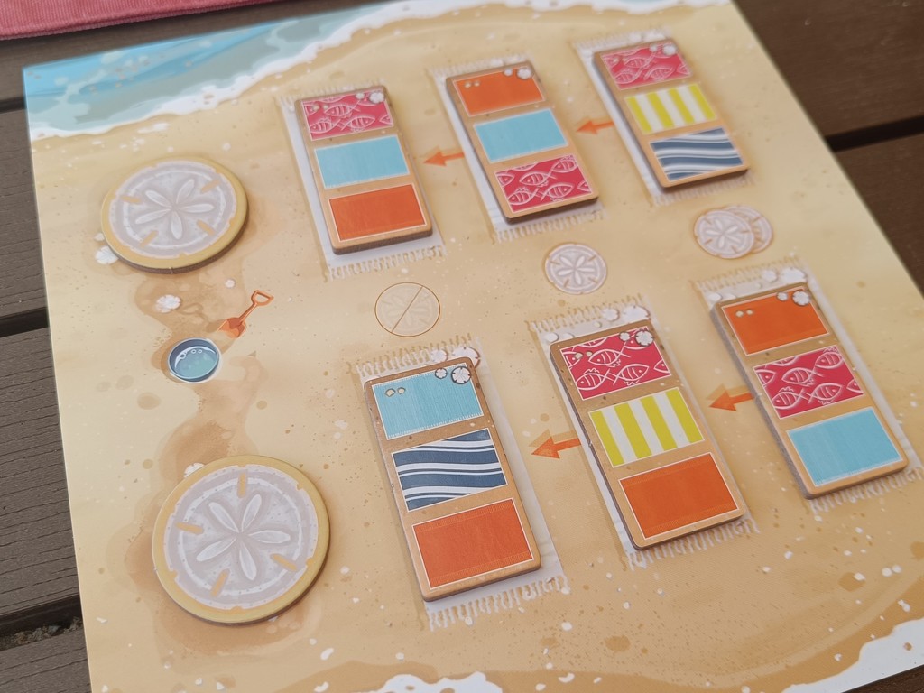 A Mauiban nem lépünk rá egymás törölközőjére, így a játékmenet kellemesen, békésen telik tizenkét körön keresztül. Mivel a piacon mindig 2x3 törölköző lesz és azonnal feltöltődik, ha valaki elvisz egyet, így bőven lesz lehetőségünk. Legalábbis első érzetre. Ugyanis a játékot 1-1 homokpénzzel kezdi mindenki és 1-1 lesz a kínálat mellett is, és ezek fixek, nincs semmilyen kassza, ahonnan további pénzt szerezhetünk. Így két fős játékban végig maximum négy pénz forog, szóval a kettő pénzbe kerülő törölköző elég zsebbenyúlós választás. Mi szinte végig a két ingyenes törölközőből választottunk, egyszer-egyszer vettük el egy pénzbe kerülő lapkát. Ha a játékostárs begyűjti a homokpénzeket és nem fizet velük, akkor a játék végéig blokkolni tudja számunkra a drágább, szélesebb választási lehetőségeket. Ezek persze szépen csúsznak előre, tehát mindig olcsósodik a kínálat. Két főnél lehet figyelni, tervezni a törölközőkkel, nagyobb játékosszámnál viszont már teljesen megváltozhat a kínálat, mire újra ránk kerül a sor.