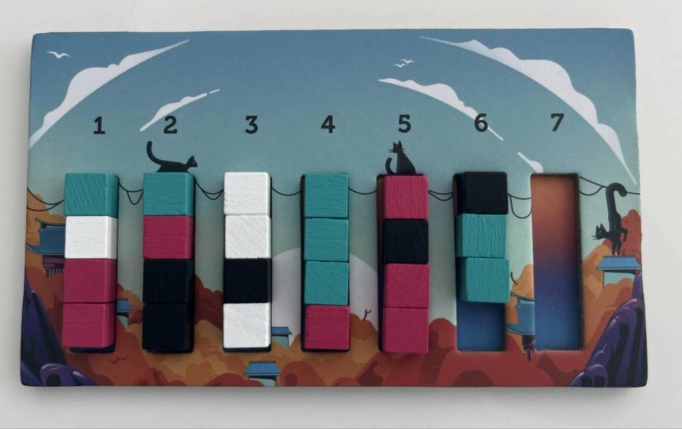 Kirakjuk a négy kerületre osztott játéktáblát, a szintszámlálót, a fehér, rózsaszín és kék denchuukat - azaz villanypóznákat -, a macskákat, a két dobókockát és a húzózsákot a kis fakockákkal.