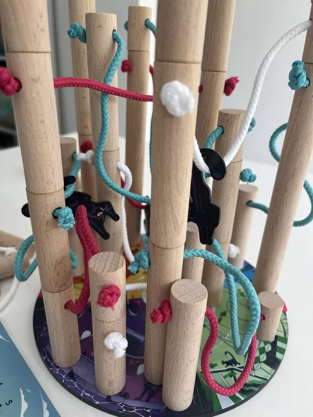 A húzózsákban a kék, a rózsaszín és a fehér kockák mellett feketéket is találhatunk. Minden fekete kocka után egy cicát kell fellógatnunk a farkánál vagy a lábánál fogva az utoljára kihúzott kockával azonos színű kábelek egyikére. Mindig csak ahhoz a kábelhez érhetnek, amin lógnak, semmi máshoz.