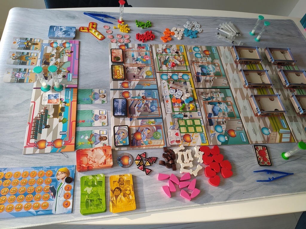 A válasz érdekében nézzük meg, hogy pontosan mi hogy működik a klinikán. Első lépésként érdemes előkészíteni a játékot. A játéktáblákat tetszőleges sorrendben az asztalra tesszük, a pontozótáblát szintén a közelbe rakjuk. A fecskendőket, infúziókat, tablettákat, intravénás gyógyszereket, szerveket és vérjelzőket a tábla mellé helyezzük. Ezután összekeverjük és a megfelelő helyre tesszük a járóbeteg- és a fekvőbetegpaklit. Ugyanígy teszünk a diagnóziskártyákkal, miután típus szerint szétválogattuk azokat. Feltöltjük a vérbankot és a gyógyszerraktárt, megkeverjük a járványkártyákat, mindenkinek osztunk csipeszeket és orvos homokórákat, a négy nővér homokórát pedig elérhető helyre tesszük, a kórtermekbe rakjuk a betegágyakat a jelölésüknek megfelelő helyre, bekészítünk egy 4 perces stoppert, előkészítjük a diagnosztikai segédeszközöket, végül kiválasztunk egy nekünk tetsző feladatkártyát, és eldöntjük, hogy melyik nehézségi szinten akarunk gyógyítani. Ennek megfelelően beállítjuk az orvospontjelzőt, a hírnévjelzőt és a fordulójelzőt. A sok pakolászás után irány végre dolgozni!