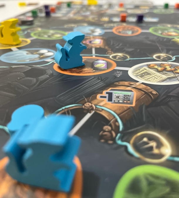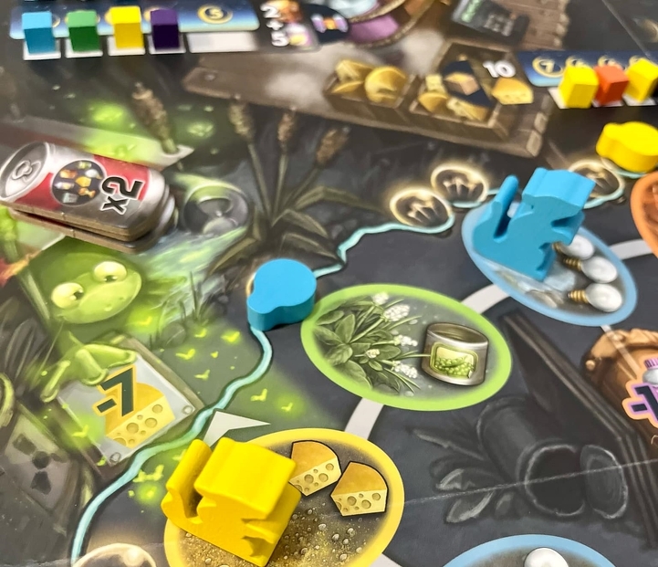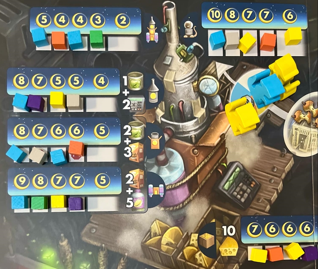 A köröm utolsó lépéseként építhetek űrhajóalkatrészt és adományozhatok sajtot a Sajtholdra vezető útra: ekkor eldobom a szükséges nyersanyagokat, és leteszem egy pontjelzőm az adott sávra. Minden sávon csökkennek a pontértékek, ezért megéri sietni, hogy beelőzzem a többieket.