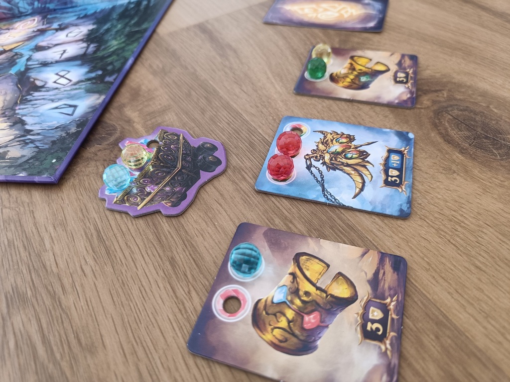 A saját körünkben az elkészült ékszereket bármikor eladhatjuk, ez nem kerül külön akcióba. A barna hátterűekért azonnal lelépjük a győzelmi pontokat, a kékekkel be lehet várni másik kék lapkákat is, így ha egyszerre váltjuk be őket, akkor az alap pontok mellett bónusz pontokat kapunk. A drágaköveket a hegy tetejére helyezzük, az ékszerlapka dobópakliba kerül, aminek a helyére választhatunk is egy újat a kínálatból, így mindig három ékszerlapka lesz előttünk.