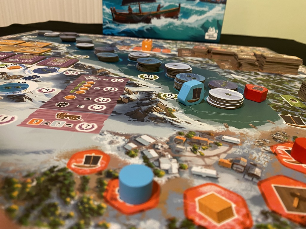 - Halászat: A kikötőből indulva, léptethetjük egyet előrébb a fjordban a halászhajónkat és elvehetünk 1 hal jelölőt és a hajón rakterébe helyezzük, vagy dönthetünk úgy, hogy visszatérünk a már megszerzett halakkal a kikötőbe, ezáltal megszerezve a rajtuk található jutalmakat és a visszatérés helyétől függően kaphatunk győzelmi pontokat is. Minél messzebb merészkedünk a kikötőtől, annál több pont lesz a jutalmunk.