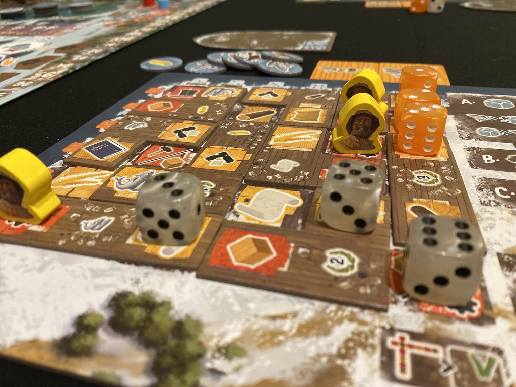 - Kocka elvétele a közös készletből: a forduló elején az összes kockával dobunk és az így kialakuló kínálatából válaszhatunk Az elvett kocka egyaránt lehet fehér vagy narancssárga is, de fontos, hogy fehér kockából legfeljebb 3-at, míg narancssárgából a forduló számával megegyező számút vihetünk el. Az így elvett kockával tudjuk a saját táblánkon a falunkban található épületeket aktiválni soronként (narancssárga kocka) vagy oszloponként (fehér kocka) sorban végig haladva és aktiválva az ott találhat épületeket. Ha nincs egyetlen nekünk ideális értékű kocka sem, egy hal beadásával tudjuk az elvett kocka értékét eggyel módosítani, de végső esetben mentőövként, akár egy halért el is adhatjuk a kockát, de erre tényleg a legrosszabb esetben lehet csak szükségünk.