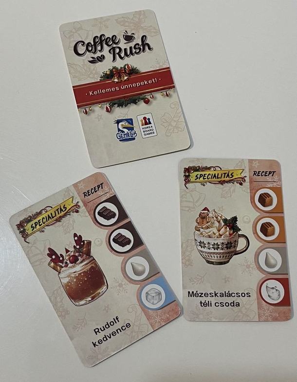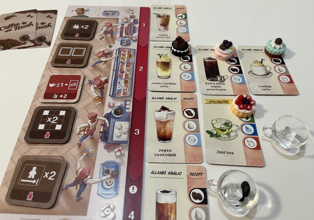 A Coffee Rush egy fél órás, könnyen tanulható, pörgős társasjáték 2 - 4 fő részére, ahol próbálunk minél több rendelést teljesíteni, és a legjobb baristává válni. Egy rendelés teljesítéséhez össze kell gyűjtenünk az adott kártyán jelzett hozzávalókat az egyik csészénkben. Ezt a hozzávalótáblán lépkedve tehetjük meg: kávészemet, tejet, gőzt, jeget, vizet, tealevelet, karamellt és csokoládét gyűjthetünk be a mezőkről, amelyekre rálépünk. Amikor sikerül elkészítenünk egy italt, kiürítjük a csészét, a teljesített kártyát a játékostábla bal felső sarkához tesszük (és megtartjuk egy-egy pontért a játék végéig, vagy három eldobásával aktiválhatunk egy fejlesztést), a balra ülő két játékosnak pedig fel kell húznia egy-egy új rendeléskártyát. Ezután a játékostábla jobb oldalán lévő rendeléskártyákat egy sávval lejjebb mozgatjuk. A negyedik sávból leeső rendeléseket sajnos nem sikerült időben teljesítenünk, ezeket a táblánk bal alsó sarkához tesszük (egy-egy mínusz pontért cserébe). Ha nincs elég kártya a pakliban, vagy valaki megszerezte az ötödik büntetéskártyáját, a fordulóval a játék is véget ér.