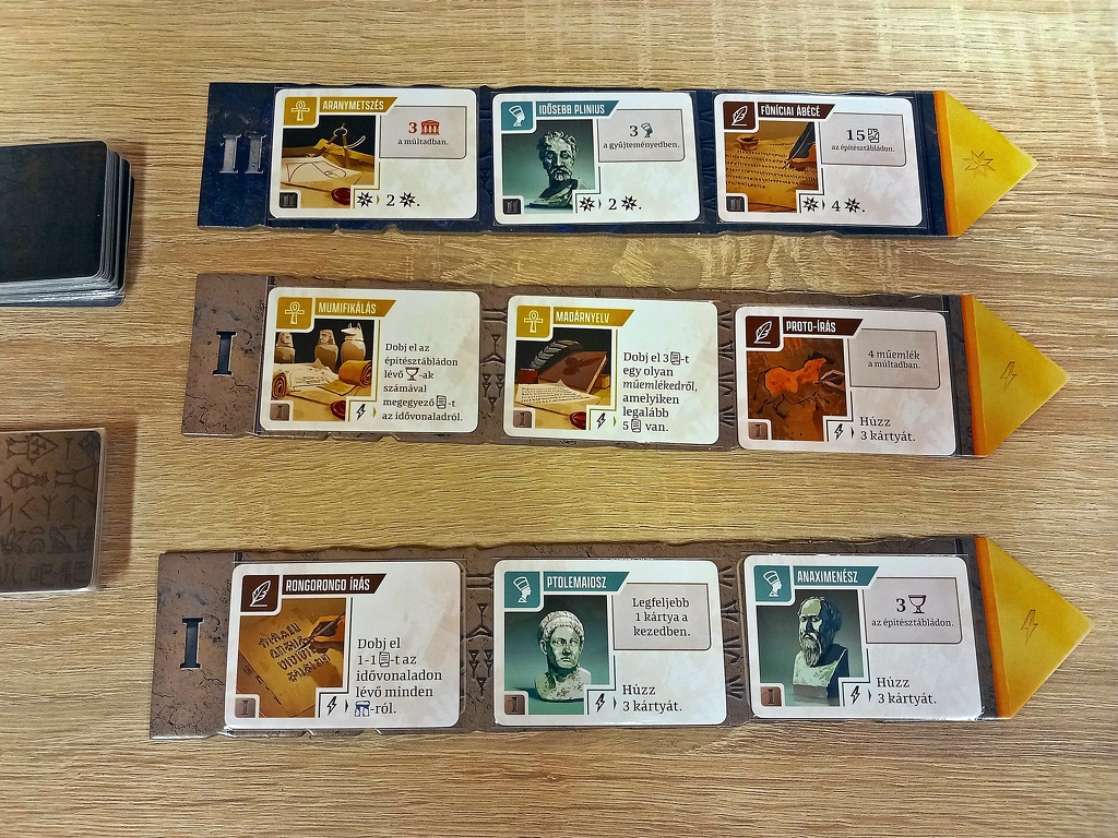A kártyák hatásainak két nagy csoportja van, az egyikkel eltávolíthatunk tudáslapkákat, a másikkal pontot szerezhetünk bizonyos feltételek mellett. Izgalmas, hogy a tudást eltávolítani meghatározott kör (idő) alatt kell, és ez végig egy feszes, izgalmas játékmenetet biztosít. Emellett a kártyák is erőforrások, velük fizetünk más kártyák kijátszásáért, az idővonal manipulálásáért, és néha a tudás eltávolításáért is. Ezen kívül semmilyen más erőforrással nem gazdálkodunk, de ez pont elég. A nagy pakli ellenére minden kártya egyedi, ezért ritka az olyan lap amire azt mondtuk “nem jó semmire”. Egy kártya eldobását mindig komoly mérlegelés előzte meg.