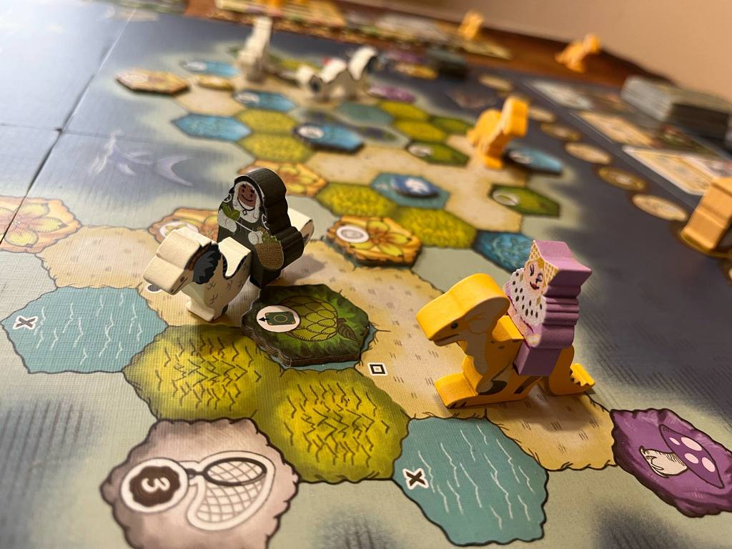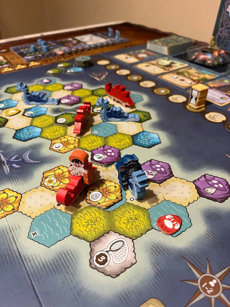 A játék elején mindenki kap három egyedi felfedezőt és egy kapitányt (utóbbinak majd kicsit később lesz jelentősége). A felfedezőinket a sziget különböző pontjaira helyezhetjük le, ezek a táblán különböző színű hexákkal vannak jelölve. A síkságra lehelyezésnek nincs költsége, de ha a hegyvidékre szeretnénk lehelyezni felfedezőt, akkor annak már egy eleség a költsége. A tóra és a különböző élőhelyekre, mint a korall, gyümölcs, virág vagy gomba élőhely nem tehetünk le felfedezőt.