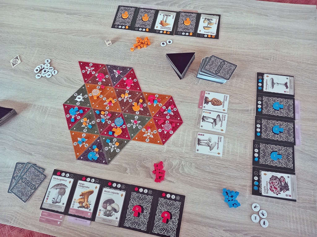 A játék az erdőben zajlik, amit háromszög lapkákból folyamatosan építünk. A lapkák különböző színűek, és egy-egy növénytársulásnak felelnek meg, ahol a gombák szívesen tenyésznek. A lapkákra kiszórt spórával építjük a hálózatunkat, az erre használt kockák pedig erőforrásként is funkcionálnak a gombák kijátszásakor.