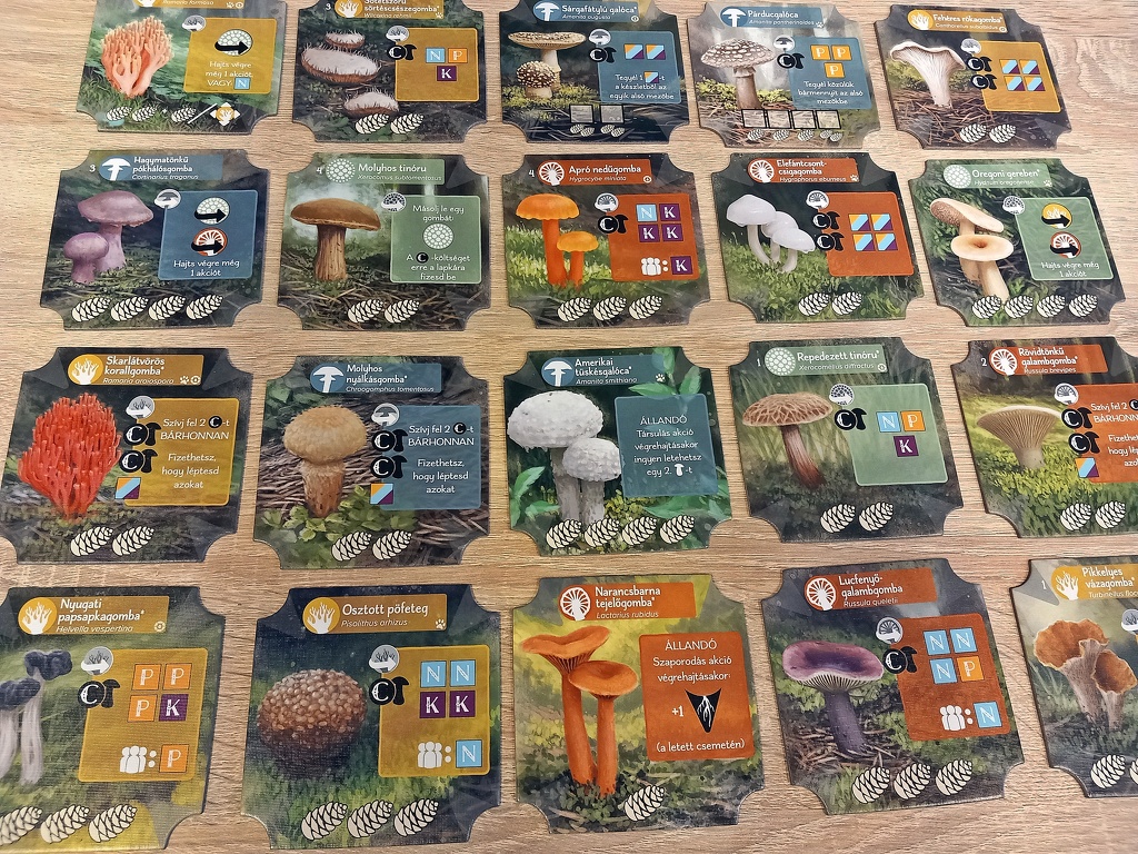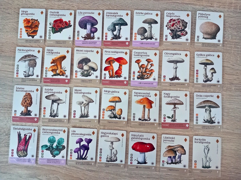 Egyébként a játékot Dr. James Scott a Torontoi Egyetem botanikus professzora tervezte, akinek a mikrogombák a szakterülete, így a játék szakmai tartalmában mi nem kételkedünk. Aki viszont edukációs célra használná, érdemes szem előtt tartania, hogy sok faj nálunk nem honos. A kártyákon a gombák latin neve szerepel, ami mellé felkerült az angol elnevezés is (már amikor van ilyen).