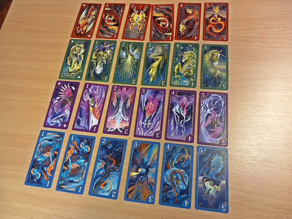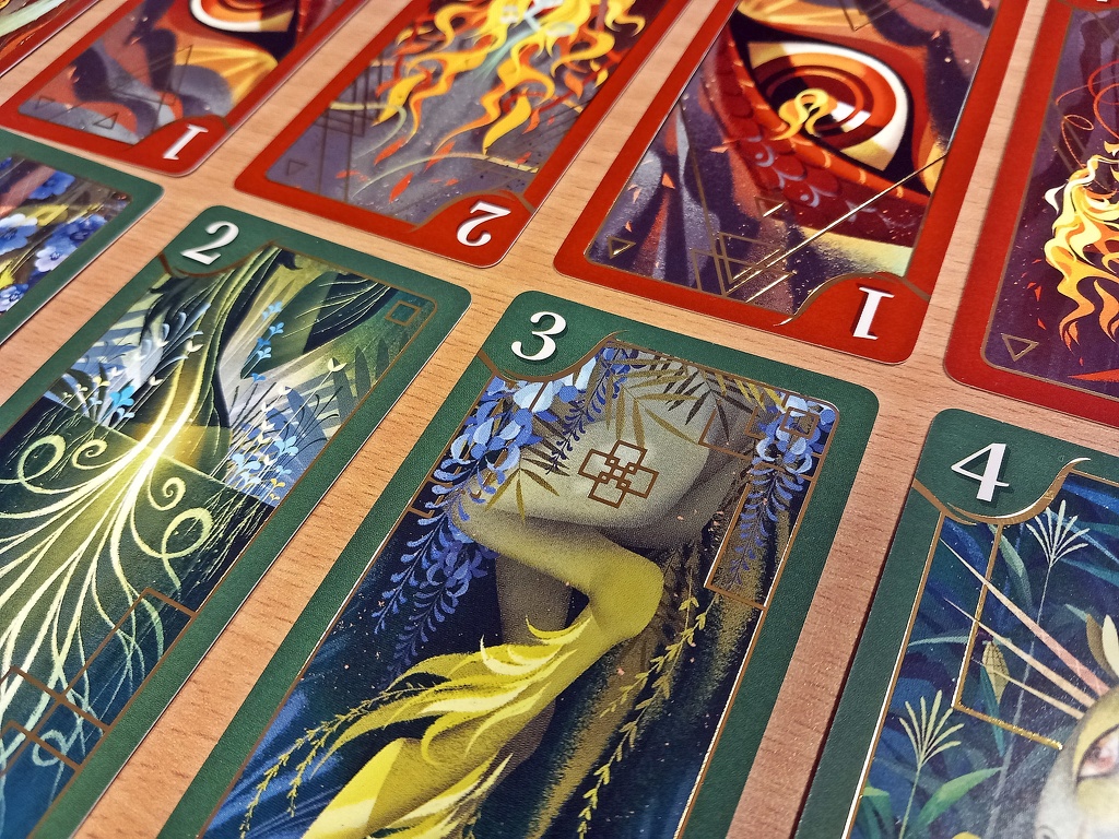 Figyeltek a színtévesztőkre is. A színekhez tartozó szimbólumok a kártyák motívum világában és az arany felülnyomásban is visszaköszönnek. Kifejezetten elegáns és példamutató megoldás.